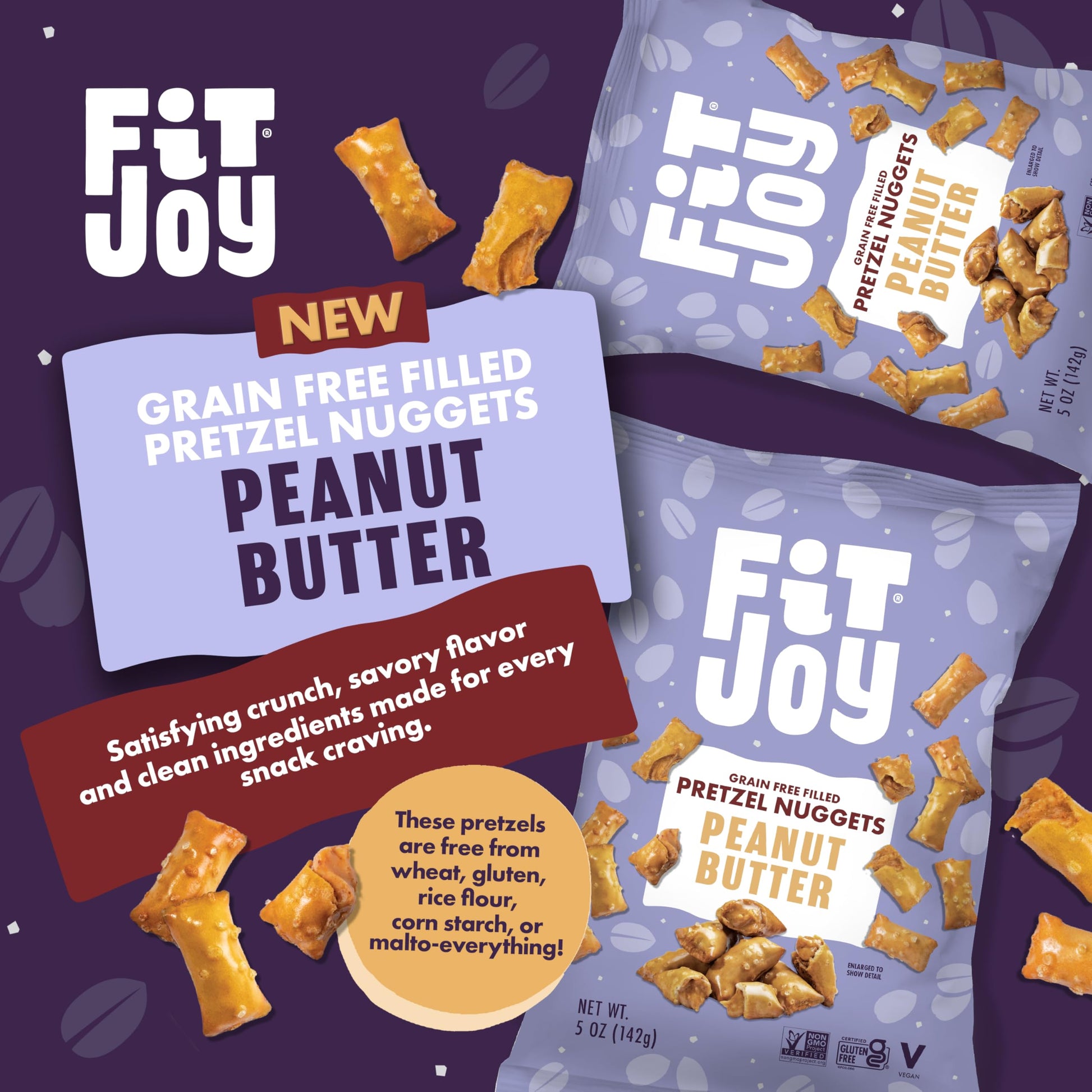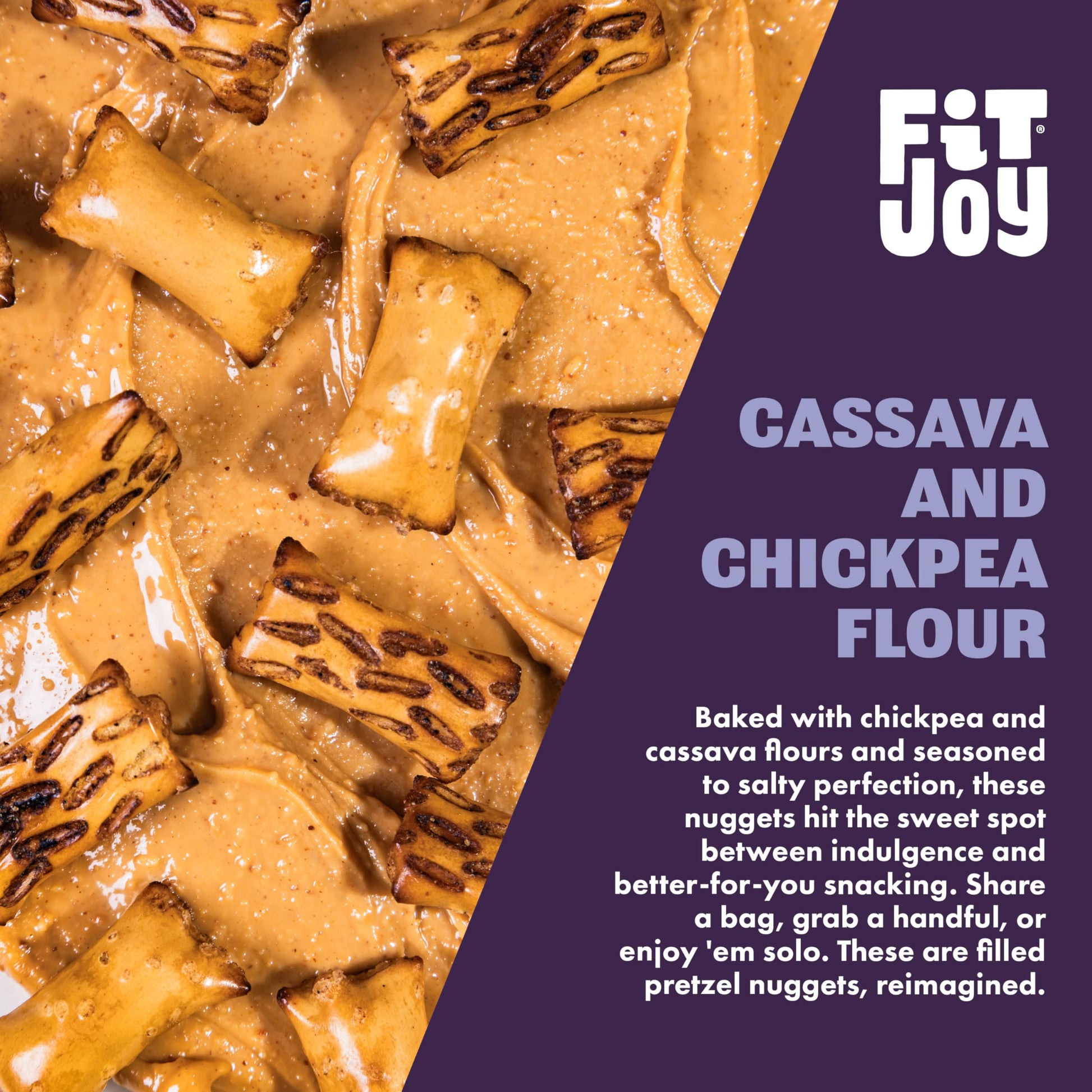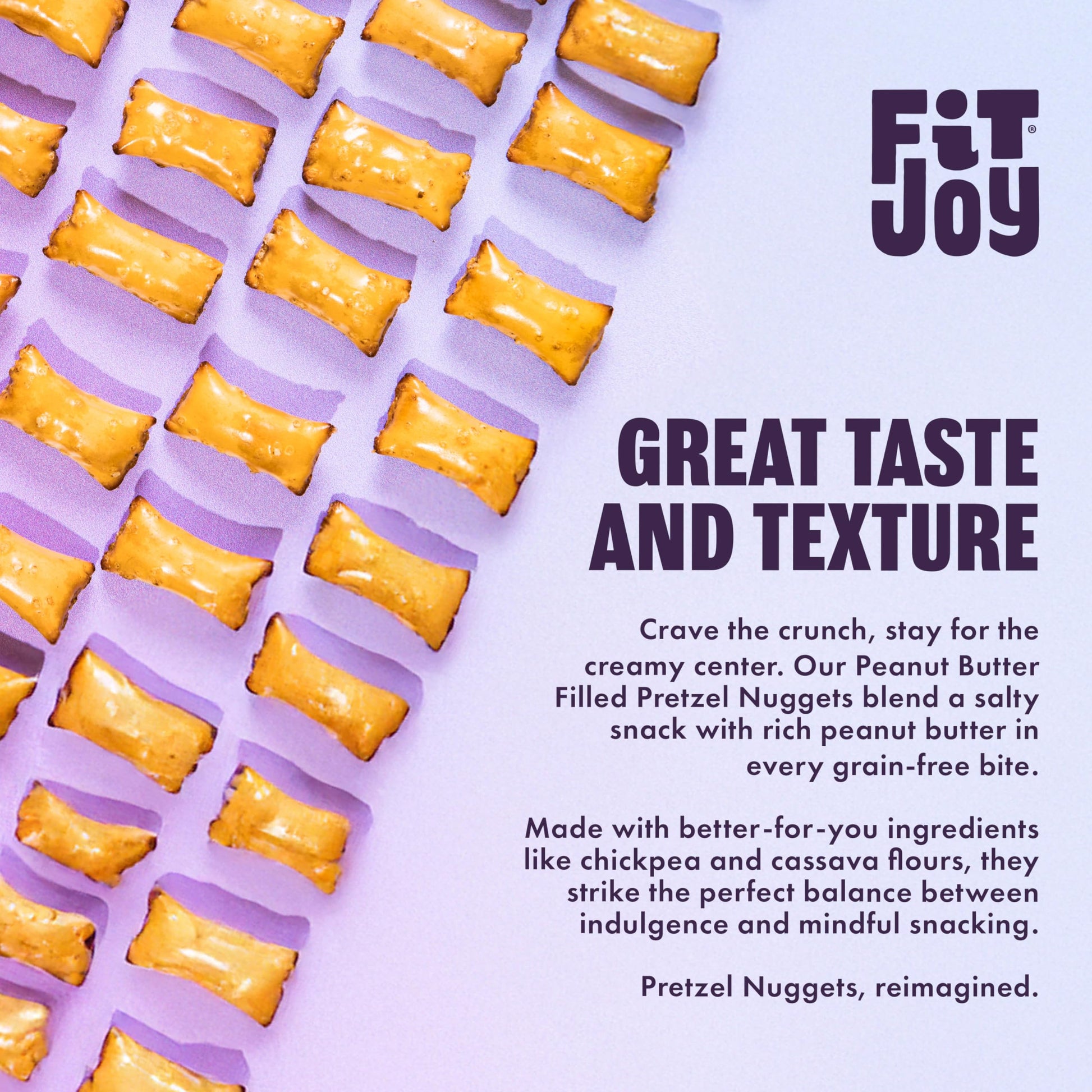 FitJoy Full-Size Peanut Butter Filled Pretzels (4 Pack, 5 Oz): Bring the fun back into snack time with our creamy, delicious peanut butter pretzel nuggets. Each bite of these grain-free gourmet pretzel snacks delivers a satisfying crunch, perfectly paired with the nostalgia of Peanut Butter. Made using chickpea and cassava flour, our gluten free peanut butter pretzels are gluten-free, dairy-free,and corn-free. Crafted with clean ingredients and bold flavors, these with no animal or animal-derived products satisfy diverse dietary preferences. With just the right balance of creamy, crunchy, and salty deliciousness, these pretzels with peanut butter filling are what your taste buds have been craving. Whether youre packing school lunches, looking for road trip snacks, or just want something crunchy, our 4-pack pretzel nuggets are made for everyone - from moms and kids to health conscious individuals - to snack on! Peanut Butter Pretzels Ingredients: Peanuts, Cassava Flour, Water, Potato Starch, Chickpea Flour, Cane Sugar, Tapioca Starch, Sea Salt, High Oleic Sunflower Oil, Date Syrup, Sunflower Lecithin, Deactivated Yeast. - About Us: FitJoy is all sorts of goodness thats ready for you to enjoy. Weve got better-for-you snacks that are tangy, twisty, cheezy and spicy. So dig in, crunch on, take a bite & share the joy because its a snack
