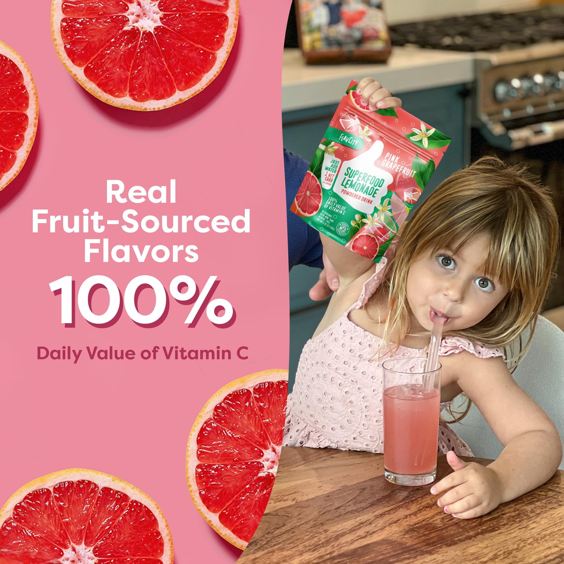 - Q: Is FlavCity Pink Grapefruit Lemonade suitable for children? A: Yes, FlavCity Pink Grapefruit Lemonade is suitable for children. It provides a refreshing drink option with beneficial Vitamin C and no added sugars.