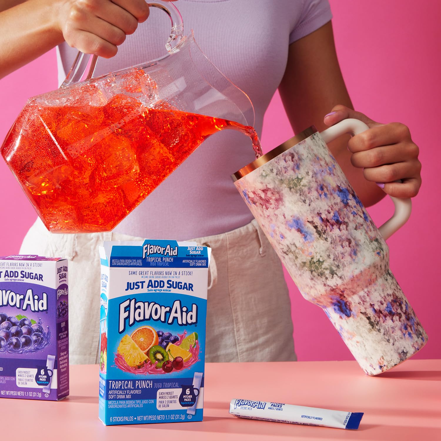 Q: How many servings does one stick of Flavor Aid Tropical Punch provide?A: Each stick of the Flavor Aid Tropical Punch Unsweetened Drink Mix is designed to make a 2-quart pitcher, which typically provides about 8 servings, depending on how much you pour per serving.