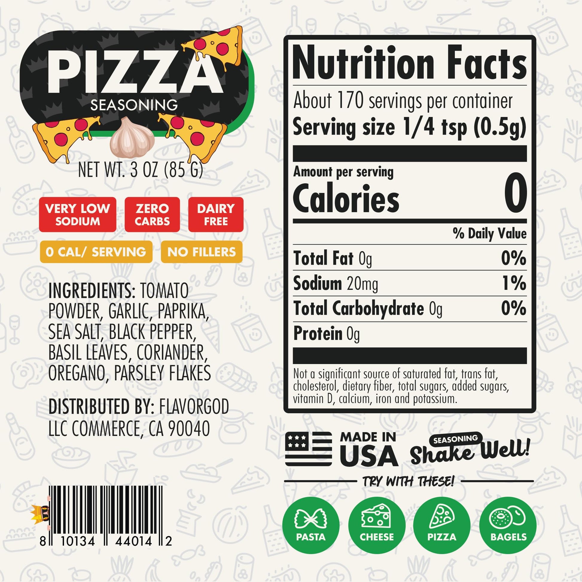 - Q: Is there any sugar or carbs in Flavor God Pizza Seasoning? A: Flavor God Pizza Seasoning contains zero carbs and sugars, making it a great option for those following low-carb or keto diets.
