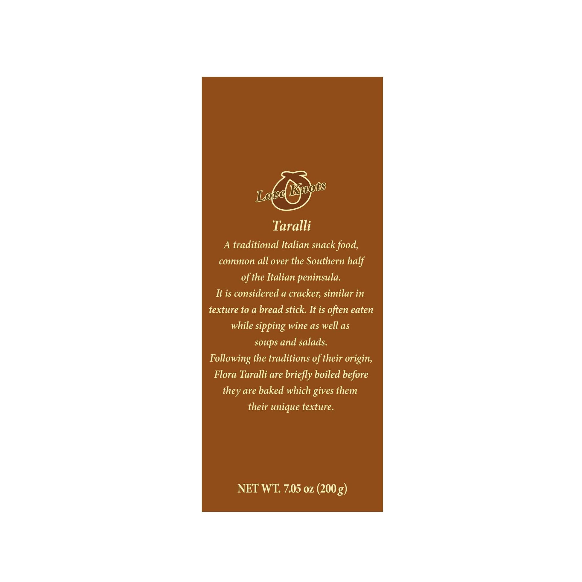 Q: What are Flora Imported Taralli made from?A: Flora Imported Taralli are made with whole wheat flour, white wine, and olive oil, ensuring a natural and wholesome snack option.