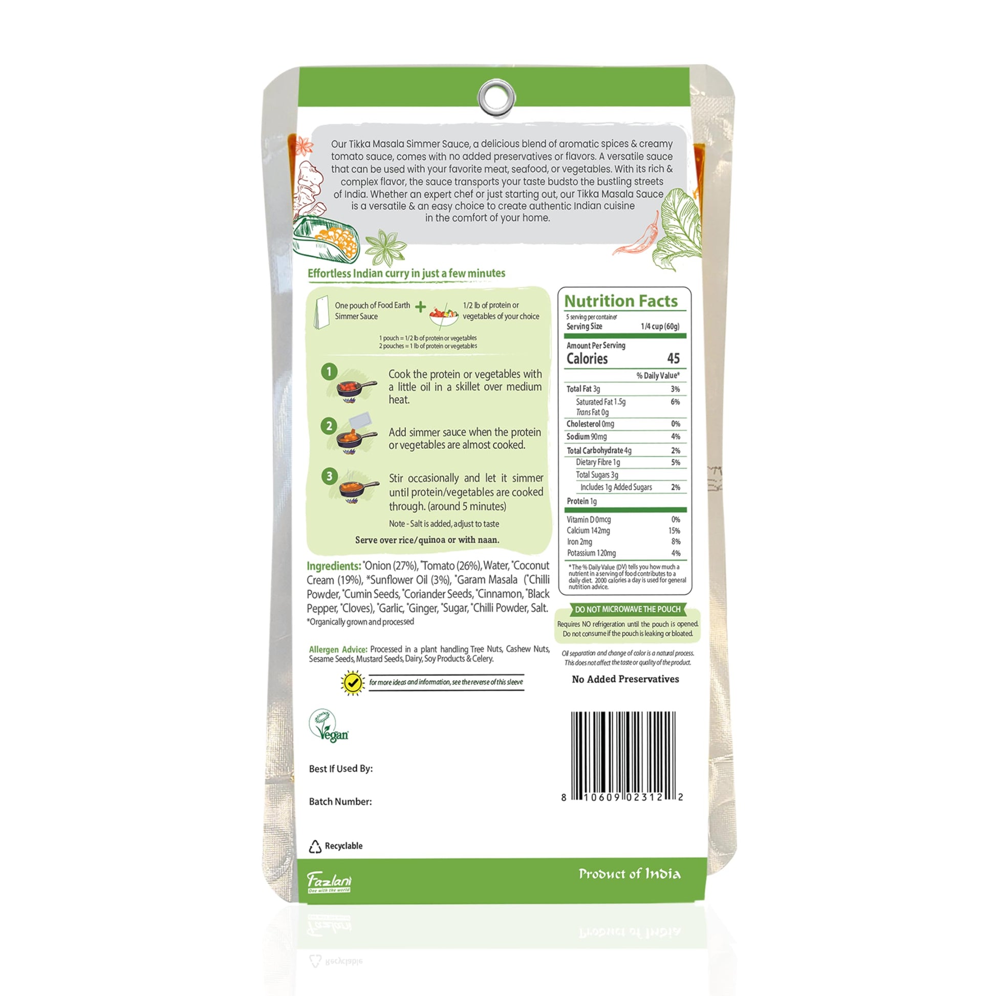 View compareFood Earth Indian Simmer Sauce - Tikka Masala - Organic, Vegan, Gluten-Free, GMO-Free - Microwavable Cooking Sauce - 12 Pouches