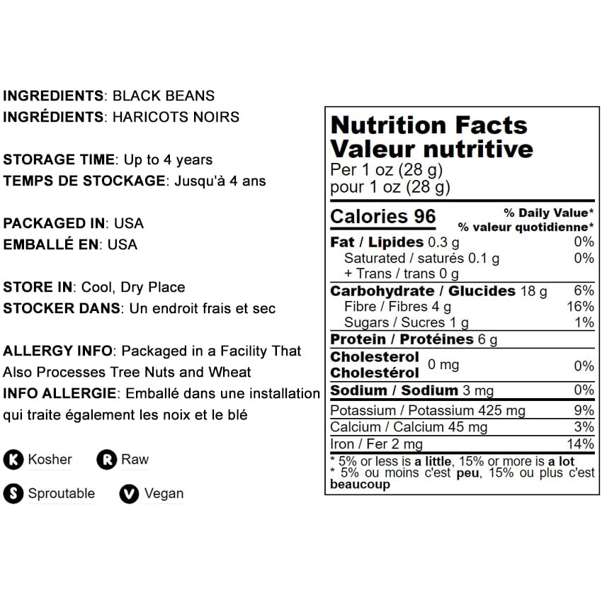 Food to Live Black Turtle Beans are carefully sourced to ensure premium quality. Each serving (½ cup) of cooked beans provides 20 grams of carbohydrates and 7 grams of highly soluble dietary fiber. These beans are rich in essential vitamins and minerals, including iron, magnesium, potassium, and B vitamins, contributing to a well-rounded diet. The beans can be easily prepared by soaking them overnight, followed by cooking methods such as simmering, baking, or using a pressure cooker for quicker results. Black Turtle Beans are popular in Latin American and Indian cuisines, where they are used in traditional dishes. They can also be enjoyed in a variety of recipes, including soups, salsas, burgers, and dips. Furthermore, they can be shared with canine companions without added spices.