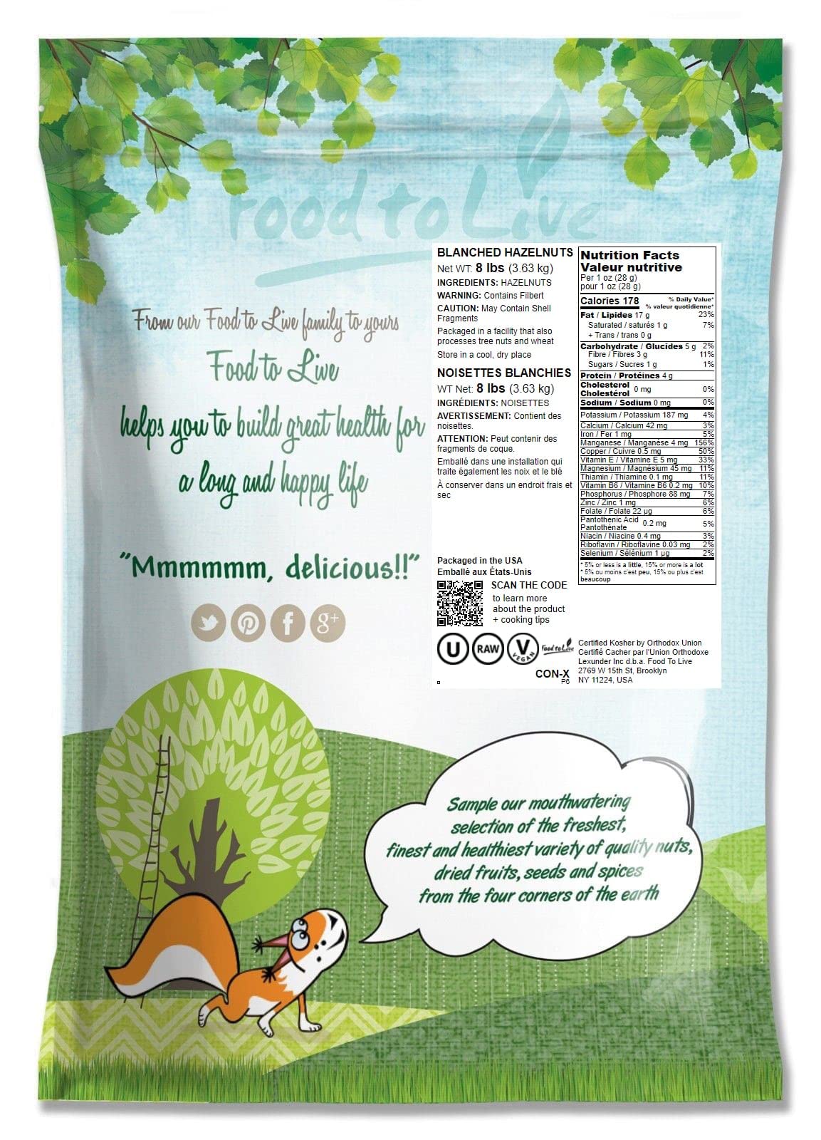 - Q: What are the health benefits of Food to Live Blanched Hazelnuts? A: Food to Live Blanched Hazelnuts are highly nutritious and provide a good source of essential vitamins and minerals including Manganese, Magnesium, Copper, Thiamin, Zinc, Phosphorus, Potassium, and Folate. They are also rich in vitamins E, B6, and Omega-6 and Omega-9 fatty acids, making them a great addition to a healthy diet.