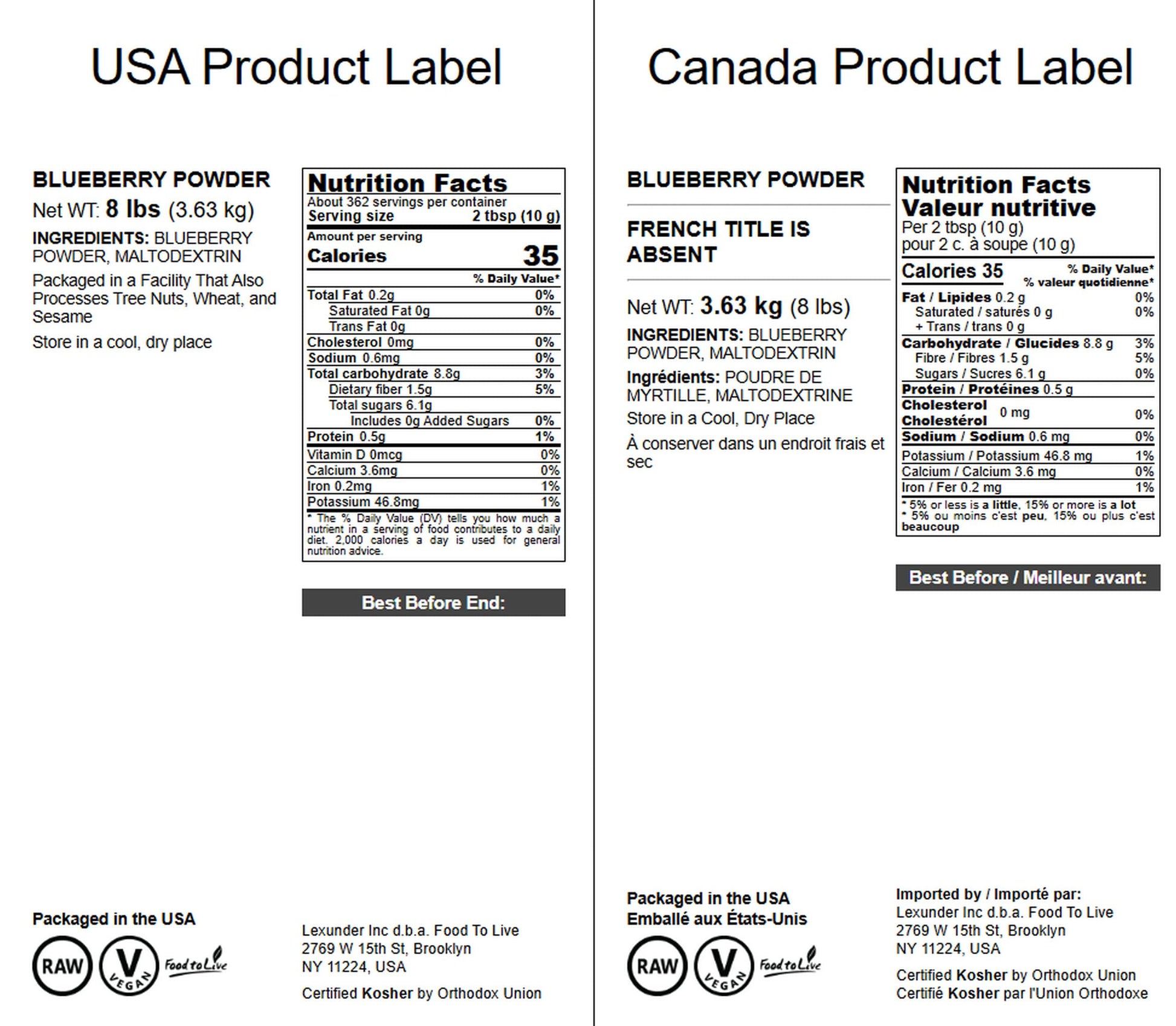 Discover A New Way To Savor The Vibrant Taste Of Blueberries With This Pure, Antioxidant-Rich Superfood. Food To Live Blueberry Powder Is Made From Whole, Ripe Berries That Undergo A Gentle Spray-Drying Process, Helping Retain Their Natural Color And Flavor. A Small Amount Of Maltodextrin Ensures A Smooth, Stable Powder Without Adding Extra Sugar. By Offering This Product In Bulk Form, We Make It Easy For You To Incorporate Its Subtle Sweetness And Bright Hue Into Daily Meals Or Special Treats. This Fine, Easy-To-Blend Powder Suits A Range Of Culinary Creations. Stir 1-2 Teaspoons (3-6G) Into Your Morning Smoothie, Or Sprinkle It Over Oatmeal For A Colorful Twist. Add It To Ice Cream Or Yogurt For A Fruity Flair, Or Mix It Into Baked Goods For An Eye-Catching Splash Of Purple. Free From Any Additives Or Preservatives, Its An Appealing Option For Those Seeking A Straightforward Ingredient To Elevate Their Recipes. Food To Live Blueberry Powder Is Also Vegan And Certified Kosher, Making It Accessible To A Variety Of Dietary Preferences. Simply Keep It In A Cool, Dry Location, Sealed Tightly Away From Moisture And Direct Light. With A Shelf Life Of Up To Two Years, You Can Enjoy Its Benefits Whenever Inspiration Strikes-Whether Youre Creating Inventive Desserts Or Refreshing Your Daily Breakfast Routine. Thanks To The Convenient Format And Naturally Flavorful Profile, This Product Brings The Essence Of Fresh Blueberries Right To Your Kitchen. Explore Countless Recipe Possibilities And Brighten Up Your Culinary Adventures With An Ingredient That Adds Both Taste And Color In Every Scoop.
