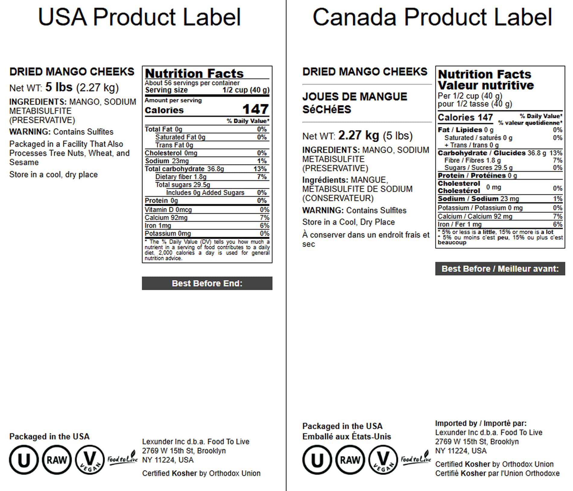 - Q: What are the main ingredients in Food to Live Dried Mango Cheeks? A: Food to Live Dried Mango Cheeks are made from 100% pure mangoes, with no added sugar, preservatives, or sulfur. They are unsweetened and unsulfured, ensuring a natural and authentic mango flavor.