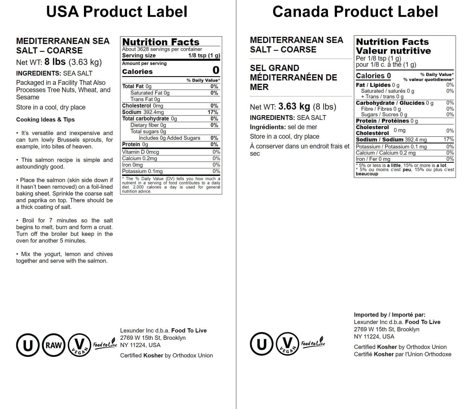 Salt is an invaluable cooking ingredient, there is no denying that it can make any dish more delicious. Its also a vital chemical compound in some baking recipes. Unlike regular table salt, Coarse Sea Salt from Food to Live is lower in sodium, so its a healthier option of this extremely versatile ingredient. Nutritional ValueHarvested from the ocean waters, Food to Live Coarse Salt contains traces of many minerals. Therefore, it enriches your dishes with both nutrients and flavor. Just dont forget that the Dietary Guidelines for Americans recommend consuming no more than 2,300 milligrams of sodium a day. DirectionsSea Salt can be used in any dish, even some sweets and desserts require this ingredient. It can be the perfect replacement for table salt in any recipe. This product is processed in a facility that also processes tree nuts and wheat.