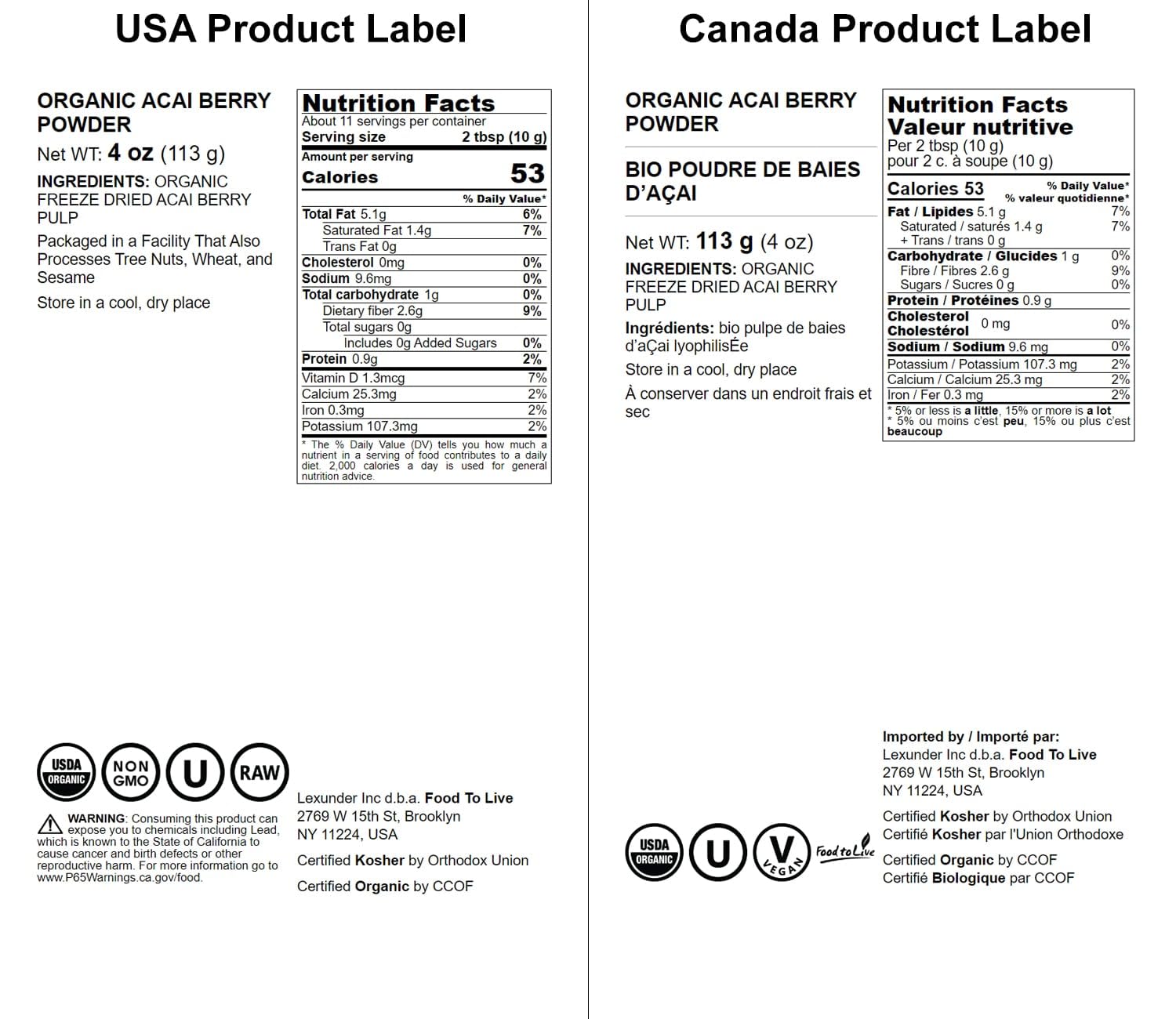 - Q: What makes this acai berry powder different from other brands? A: Food to Live Organic Acai Berry Powder stands out due to its high purity, being certified organic, and free from additives, toxins, and caffeine. It is also non-GMO and kosher, ensuring a high-quality product for health-conscious consumers.