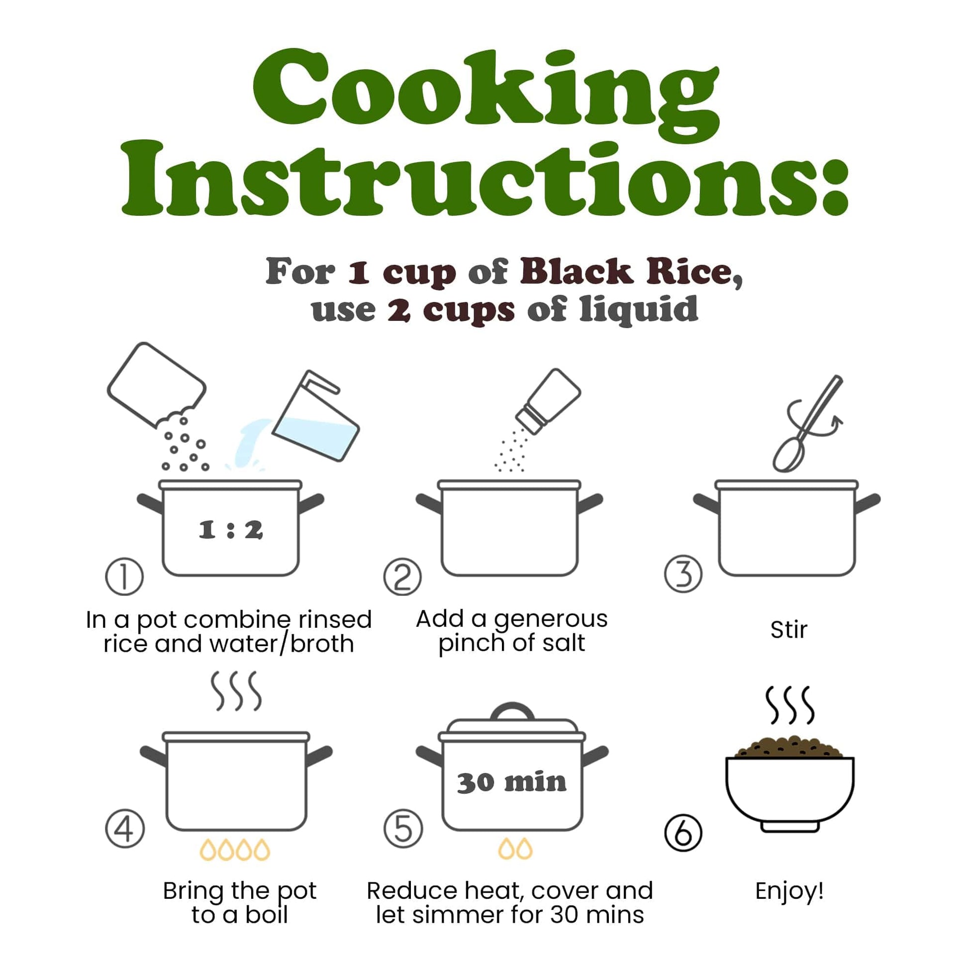 - Q: Does Organic Black Rice require special cooking instructions? A: Cooking Organic Black Rice is similar to other whole grains. Rinse it before cooking, then combine one part rice with two parts water. Bring to a boil, reduce heat, cover, and simmer for about thirty to forty minutes until tender.