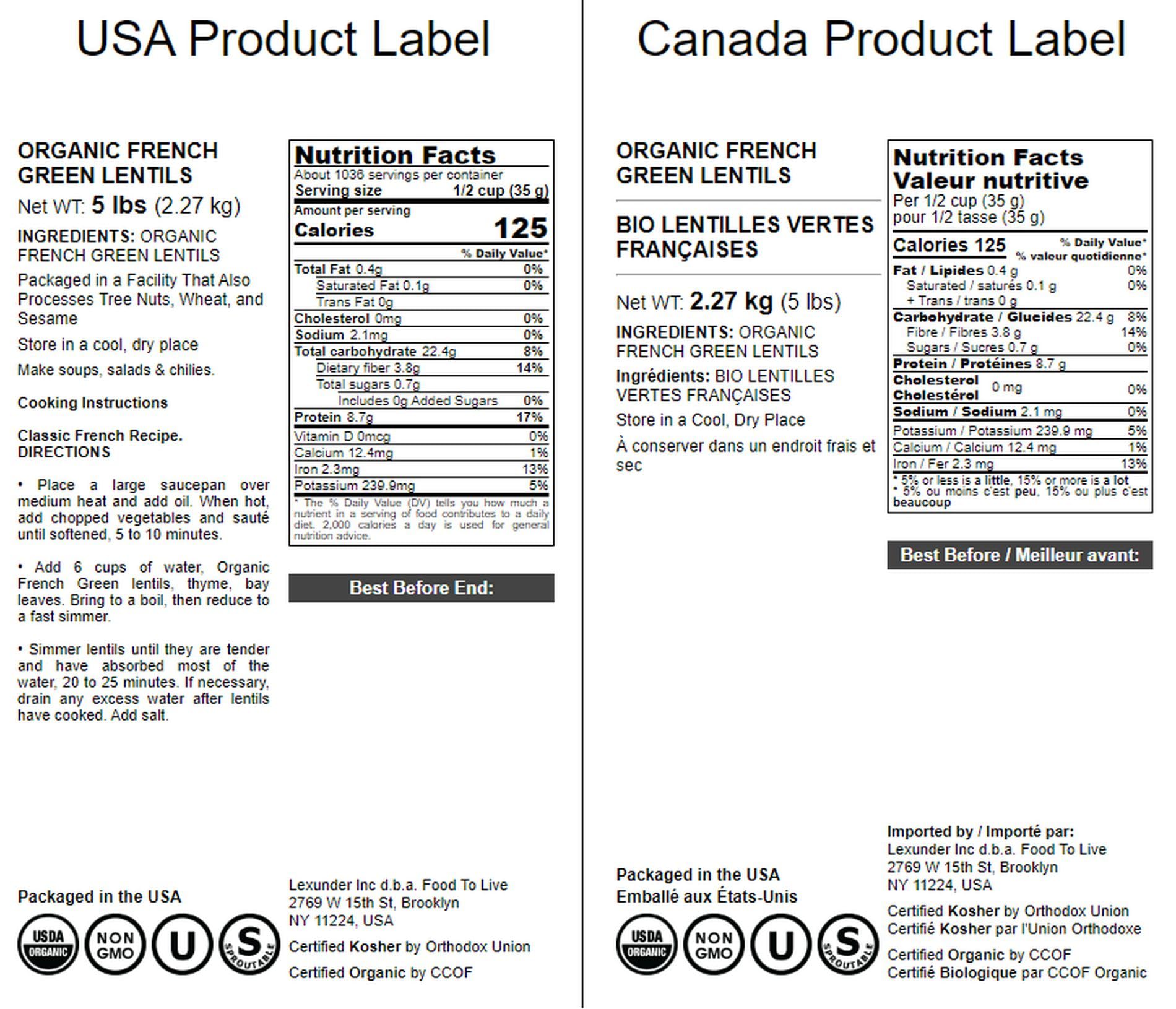 - Kosher, Non-GMO, Organic, Raw, Sproutable, Vegan - Whole Raw Lentils - Very low in Saturated Fat, Cholesterol, and Sodium - A Good Source of Thiamin, Iron, Phosphorus, Manganese, Dietary Fiber, and Folate Organic French Green lentils: Rich in Flavor and Texture Organic French Green Lentils is a rare type of lentil, smaller and firmer than the regular green one. First grown in France, today they are a popular ingredient in many European dishes. French Organic Lentils is a diverse cooking ingredient so that you can use them in many fabulous meals. They take a bit longer to cook and remain firm due to their texture. Eating lentils regularly is beneficial, not only because they are low in calories, but they are an excellent plant-based source of protein, fiber, B vitamins, and some essential minerals. Its a Keeper! How to Eat Organic French Green Lentils Organic French lentils taste amazing in chilies and stews. Since they retain shape instead of turning mushy, it helps define the taste of some familiar dishes. The peppery flavor of the lentils gives an exciting addition to many savory recipes. You can cook organic French lentils in large portions and store them in the fridge for up to a week. Add cooked lentils to salads or hummus, or mix them with other beans, onion, and spices to make veggie burgers. French Organic Lentils also used in light soups where the firm texture of the legume is prominent. Organic French lentils dont have to be pre-soaked before cooking. Rinse through with cold water, bring to the boil, and simmer for 20-30 minutes. Add seasoning at the end of the cooking process._Nutrition Facts 1 servings per container Serving size1 oz (28 g) Amount Per Serving Calories97 % Daily Value* Total Fat 0.3g 0% Saturated Fat 0.04g 0% Trans Fat 0g Cholesterol 0mg 0% Sodium 2mg 0% Total carbohydrate 17g 6% Dietary fiber 9g 31% Total sugars 1g Includes 0g Added Sugars 0% Protein 7g 15% Vitamin D 0mcg 0% ?alcium 16mg 1% Iron 2mg 12% Potassium 271mg 6% Folate 136mcg 34% Thiamin 0.2mg 21% Copper 0.1mg 16% Manganese 0.4mg 16% Zinc 1mg 12% Phosphorus 128mg 10% Vitamin B6 0.2mg 9% Magnesium 35mg 8% Riboflavin 0.1mg 5% Niacin 1mg 5% Selenium 2mcg 4% Vitamin ? 1mg 1% Vitamin E 0.1mg 1% Vitamin K 1mcg 1% * The % Daily Value (DV) tells you how much a nutrient in a serving of food contributes to a daily diet. 2,000 calories a day is used for general nutrition advice. Ingredients: ORGANIC FRENCH GREEN LENTILS Storage Time: Up to 4 years Country of Origin: the USA Packaged in: the USA Store in: Cool, Dry Place Allergy Info: Packaged in a Facility That Also Processes Tree Nuts, Wheat, and Sesame Kosher Non-GMO Organic Raw Sproutable Vegan