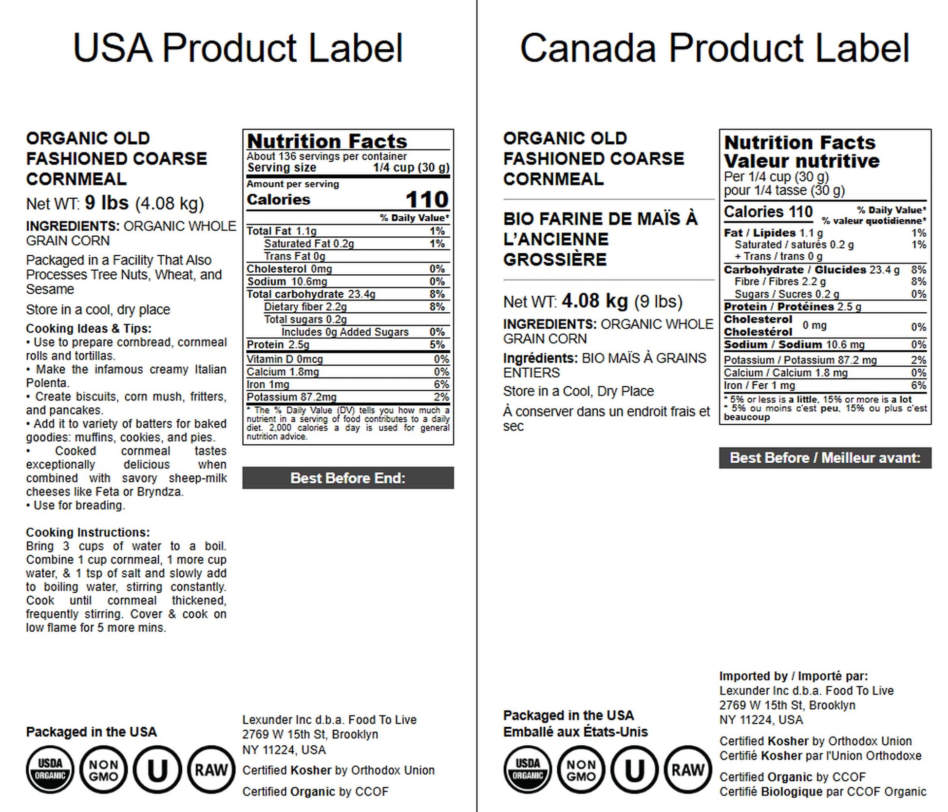 • Q: What are the main benefits of using Food to Live Organic Old Fashioned Cornmeal? A: Food to Live Organic Old Fashioned Cornmeal is made from whole-grain corn, preserving essential nutrients. It is organic, kosher, vegan, and cholesterol-free, making it a healthy choice for various recipes. Additionally, it's a great source of protein and fiber, which can help keep you full longer.