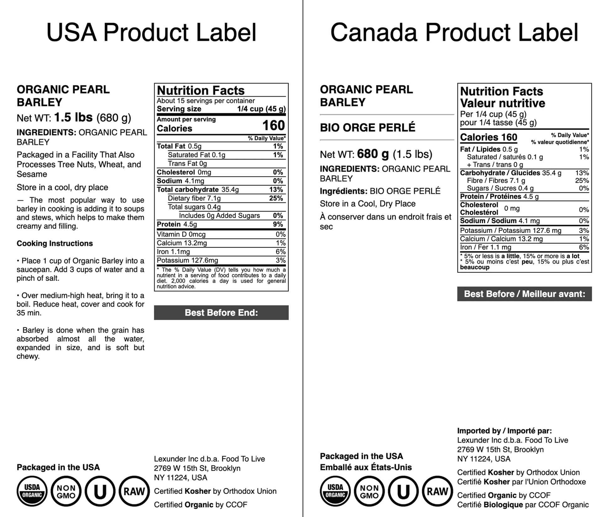 - Q: Is Food to Live Organic Pearl Barley kosher certified? A: Yes, Food to Live Organic Pearl Barley is kosher certified, ensuring it meets dietary guidelines for those who observe kosher practices.
