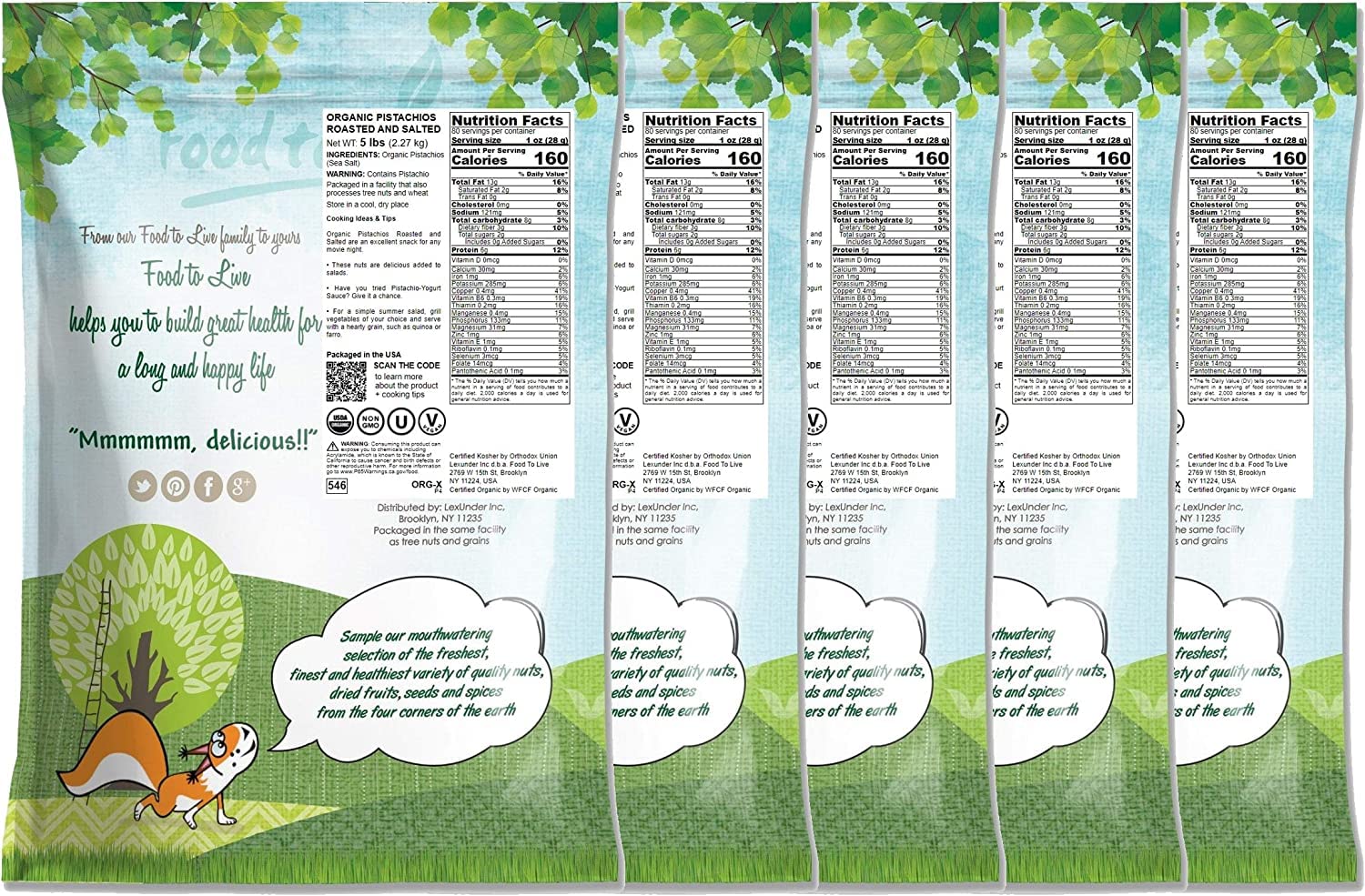- Q: What makes Food to Live pistachios different from other brands? A: Food to Live pistachios are sourced from California's best farmers and are organic certified. They are dry roasted and seasoned with sea salt, ensuring a rich flavor without any toxins or harmful additives.