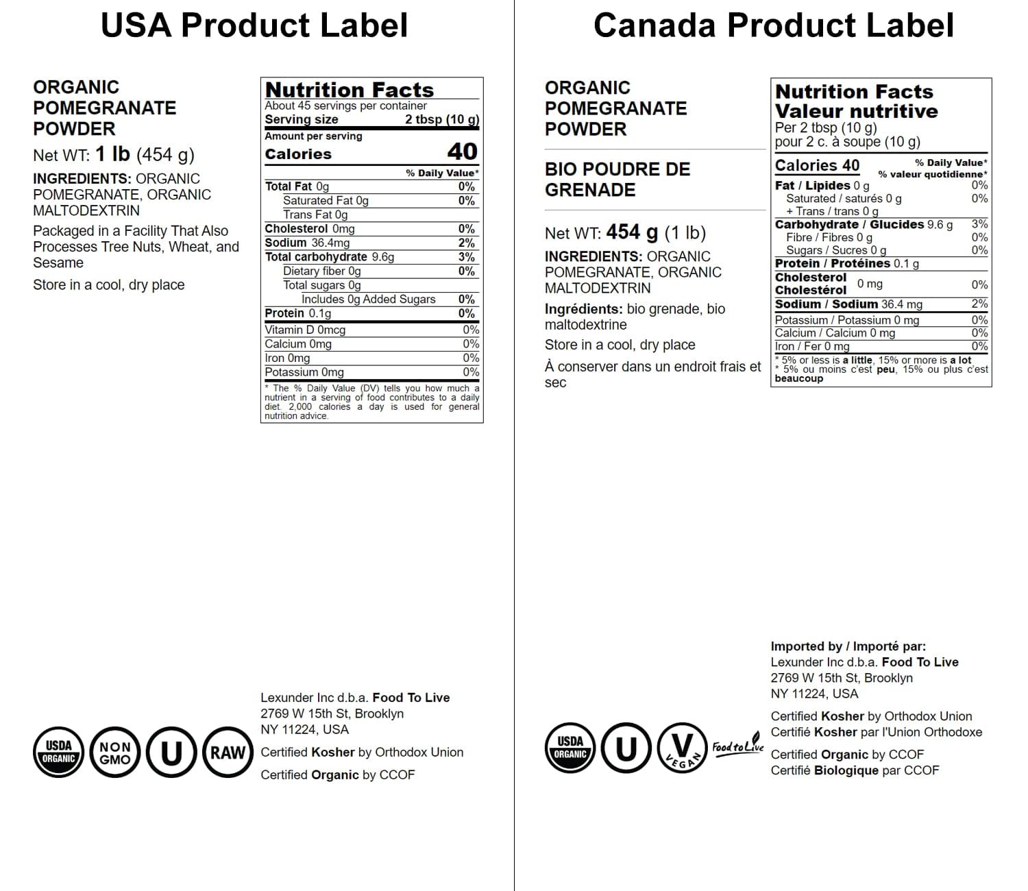 - Q: Does this pomegranate powder contain any additives or preservatives? A: No, Food to Live Organic Pomegranate Powder is unsulfured and does not contain any artificial additives or preservatives, ensuring you are consuming a pure and natural product.