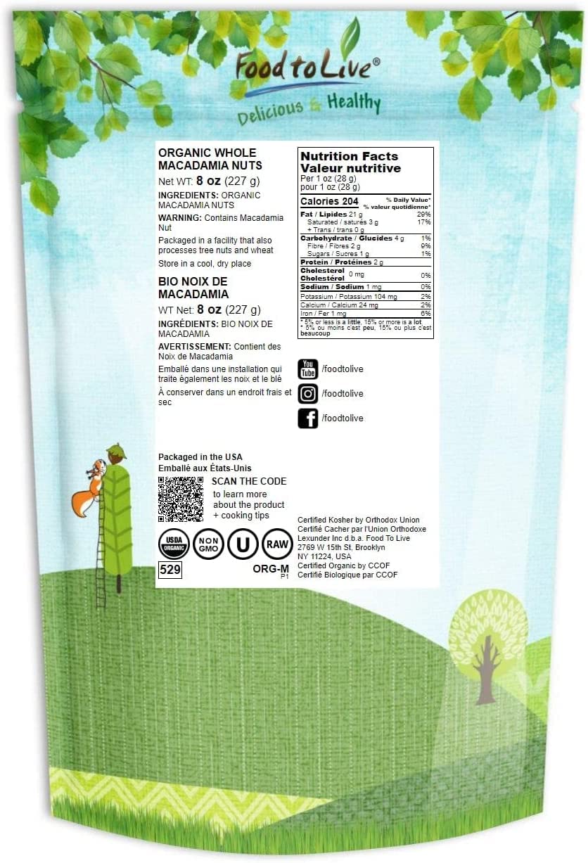 - Q: What is the size of the Food to Live Organic Whole Macadamia Nuts package? A: The Food to Live Organic Whole Macadamia Nuts come in an 8-ounce package, which is approximately 0.5 pounds. This size is convenient for both personal use and sharing.
