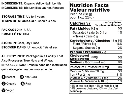 Food To Live Organic Yellow Split Lentils, 1 Pound - Non-Gmo Golden Lentils, Raw, Dried, Vegan, Kosher, Bulk, Good Source Of Protein, Fiber, And Iron. Low Sodium, Low Fat, For Cooking, Soups, Chili.