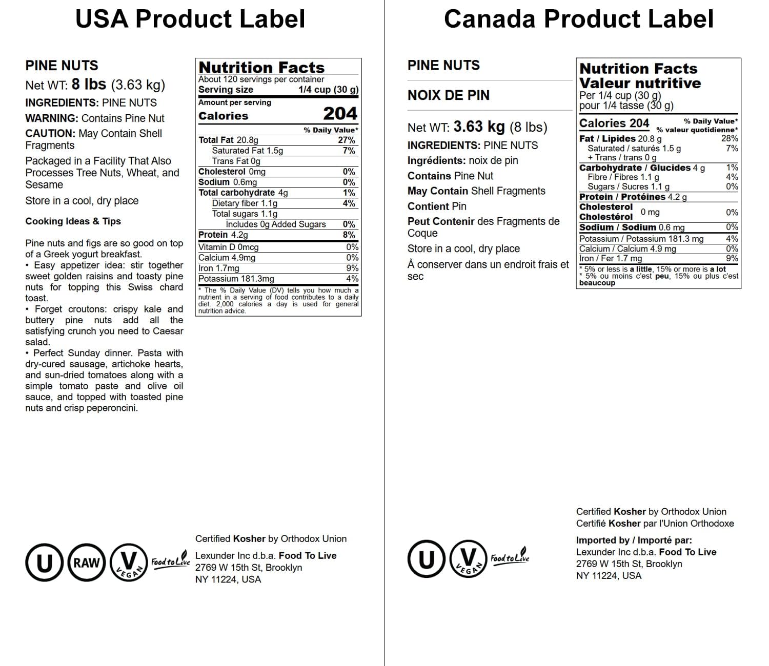 Q: Are these pine nuts raw and kosher certified?A: Yes, Food to Live's pine nuts are both raw and kosher certified, ensuring they meet high-quality standards for dietary preferences.