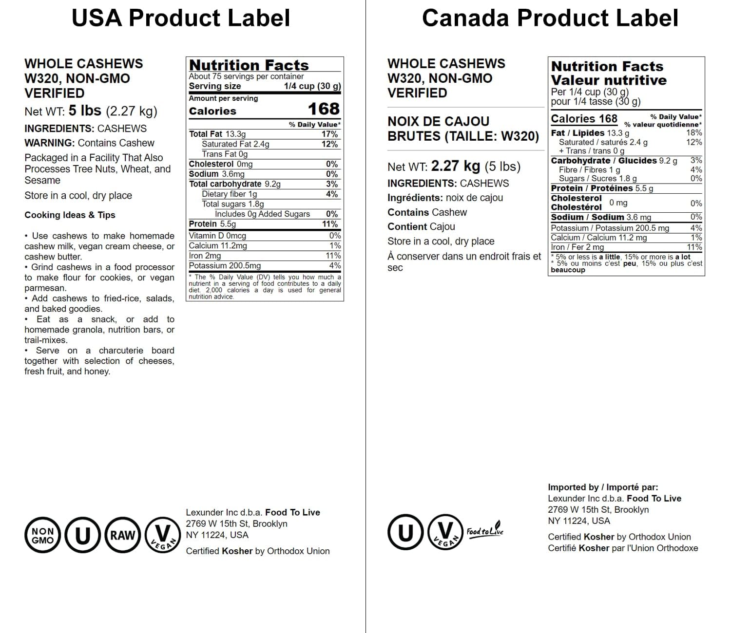 Raw Whole Cashew Nuts From Food To Live Are Fresh And Delicious. They Can Be Used In A Variety Of Dishes Or Eaten Plain As A Snack. Their Most Extraordinary Feature Is A Sweet Buttery Flavor That Complements All Kinds Of Foods. Nutritional Value Cashews Are Highly Nutritious And Great For You. They Provide Your Body With A Healthy Dose Of: - Dietary Fiber - Calcium - Iron - Copper - Manganese Cashew Nuts Are A Great Source Of Protein And Can Be Used In Protein Shakes You Take To The Gym. Directions Food To Live Raw Cashew Nuts Are Delicious Regardless Of How You Eat Them. You Can Add Them To Desserts Or Sauces To Enrich The Flavor Of Your Favorite Dishes. Our Cashews Can Be Used To Make Delicious Nut Milk That Is A Great Addition To Any Diet. It Doesnt Matter If You Eat Them Raw Or Roasted As Their Nutritional Value Changes Very Little. However, Roasted Cashews Taste Sweeter And More Buttery. If You Buy Them Raw, You Can Roast The Nuts To Your Taste. This Product Is Processed In A Facility That Also Processes Wheat. Warning: Contains Tree Nuts!