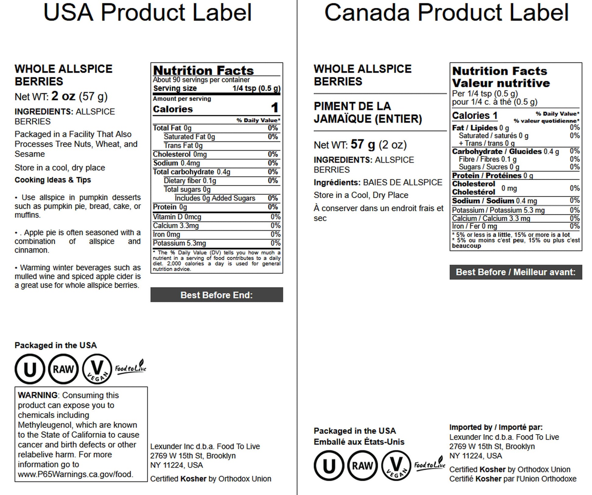- Q: What is the size of the package for Food to Live Allspice Berries? A: Food to Live Whole Allspice Berries come in a two-ounce package, which is suitable for both home use and as a refill for spice grinders.