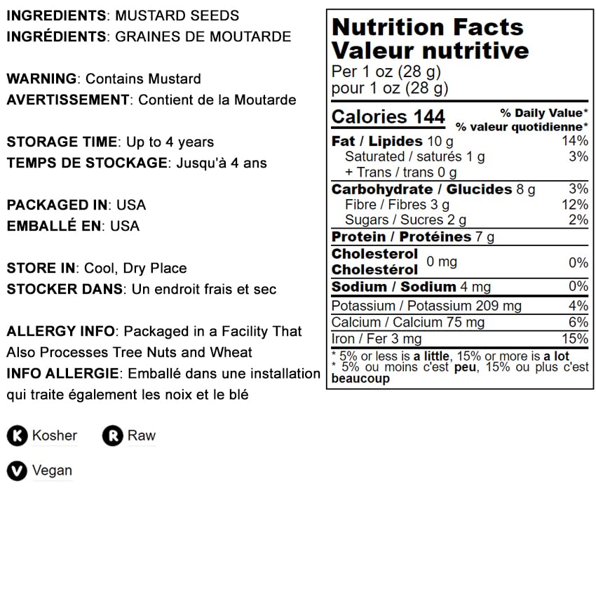 Mustard seeds are used to create hot condiments that enhance the flavor of your dishes. They can help you create excellent marinades and sauces. Nutritional Value Food to Live Yellow Mustard Seeds are a premium-quality product packed with essential nutrients. Adding them to your dishes will make the food tastier. The most important nutrients contained in these seeds are: - B vitamins - Selenium - Phosphorus - Manganese. Directions Store the seeds in their in a cool and dry place, away from sunlight. This way, seeds will remain usable for up to 4 years. If stored in a fridge, within an opaque container, the seeds can last even longer. . To release the flavor of the seeds fully, soak them in warm water for ten minutes before adding to the recipe. You can make them less hot by soaking the seeds in an acidic liquid (water with a bit of lemon juice). This product is processed in a facility that also processes tree nuts and wheat.