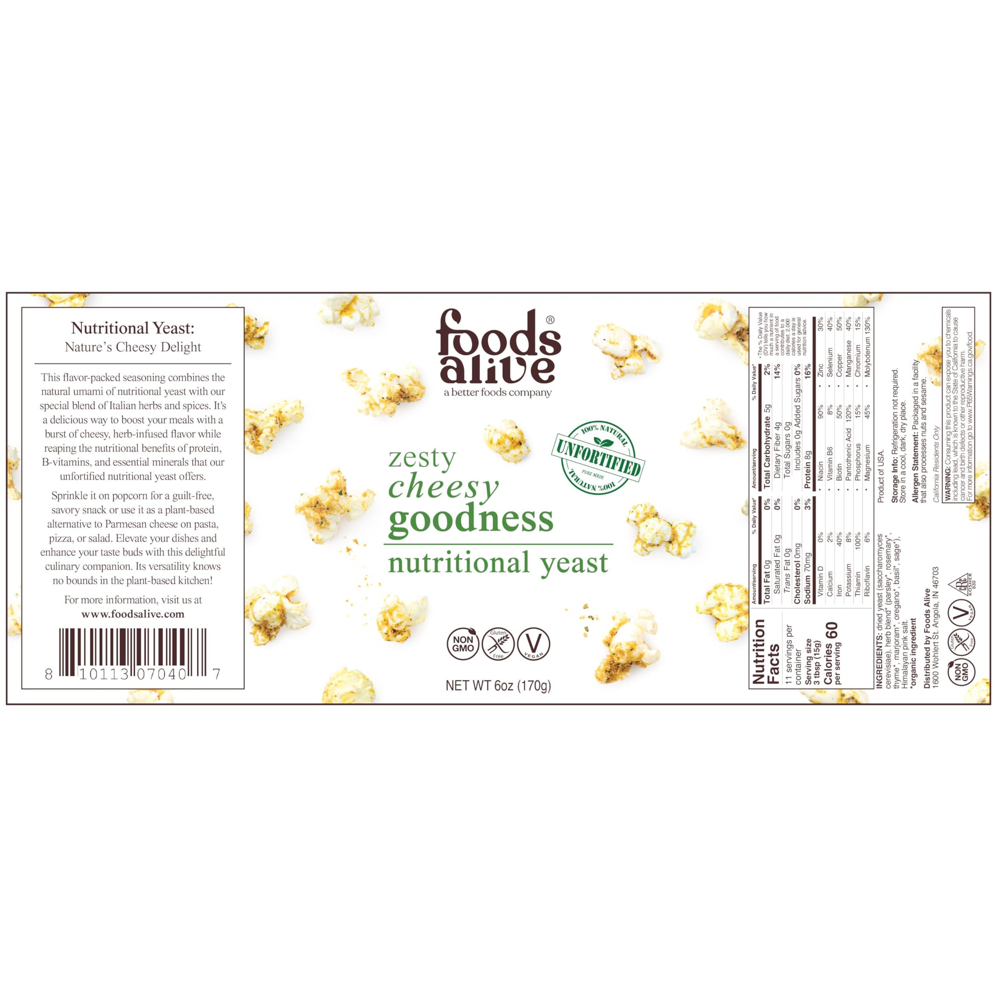 Q: How should I store the nutritional yeast once opened?A: To maintain freshness, store your Foods Alive Zesty Cheesy Goodness in a cool, dry place. Keeping it in an airtight container can help preserve its flavor and nutritional benefits.