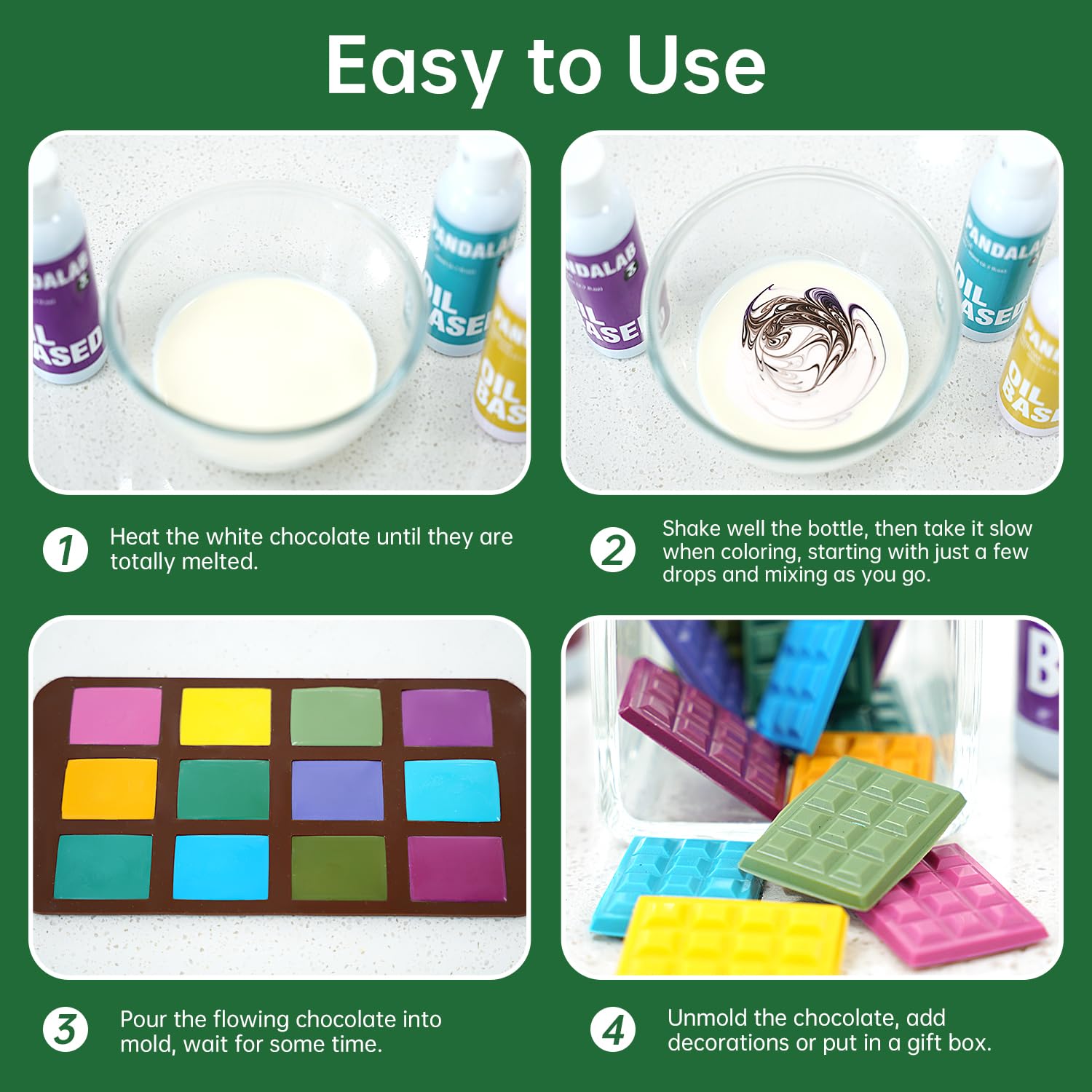 Q: Can I use this food coloring for chocolate and candy melts?A: Absolutely! This oil-based dye is specially designed for use with chocolate, candy melts, and other fat or oil-based substances, providing vibrant colors without fading.