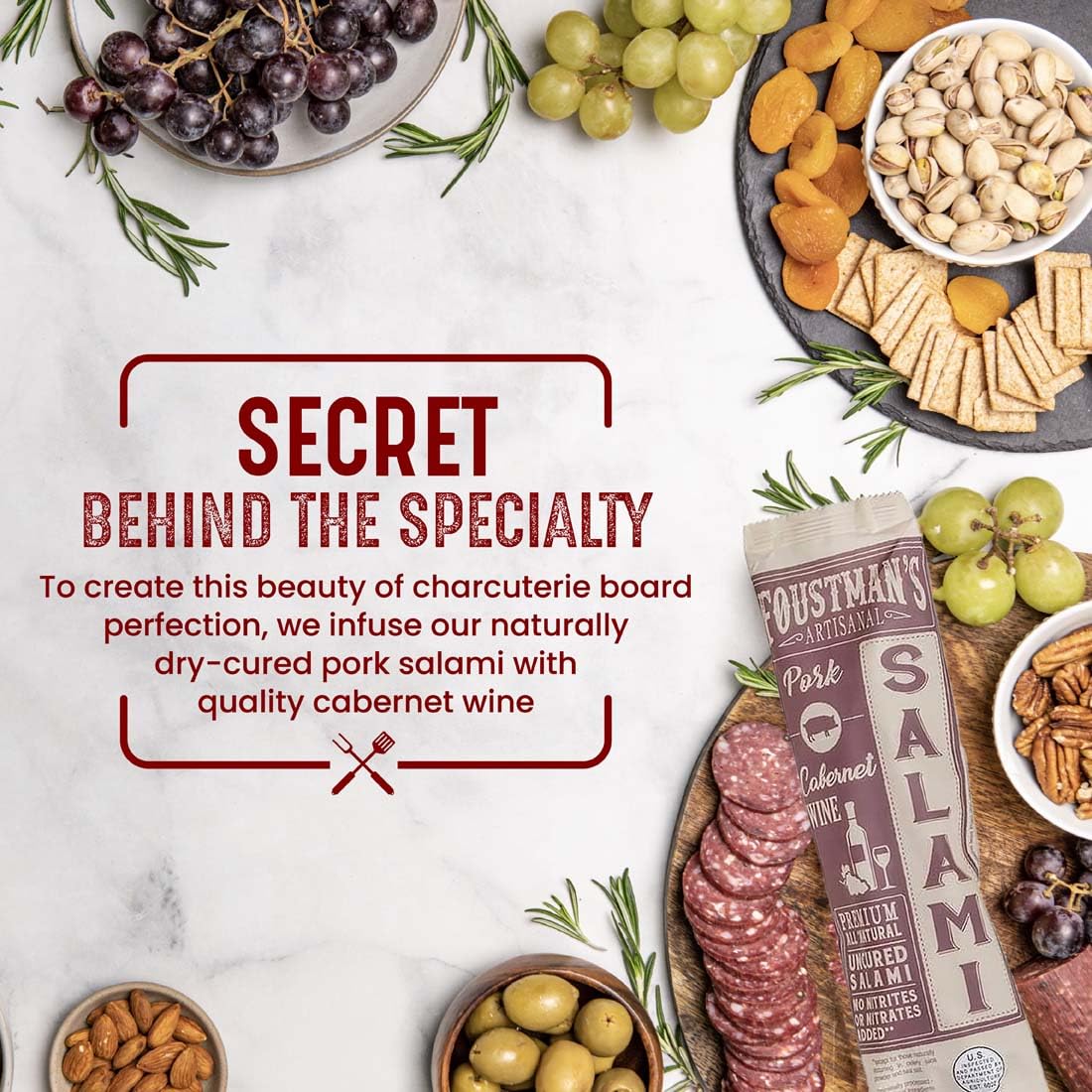 - Q: What ingredients are used in Foustman's Salami? A: Foustman's Salami is made from a mix of pork and quality cabernet wine. It is naturally dry-cured without chemical nitrates or nitrites, adhering to traditional Italian methods.