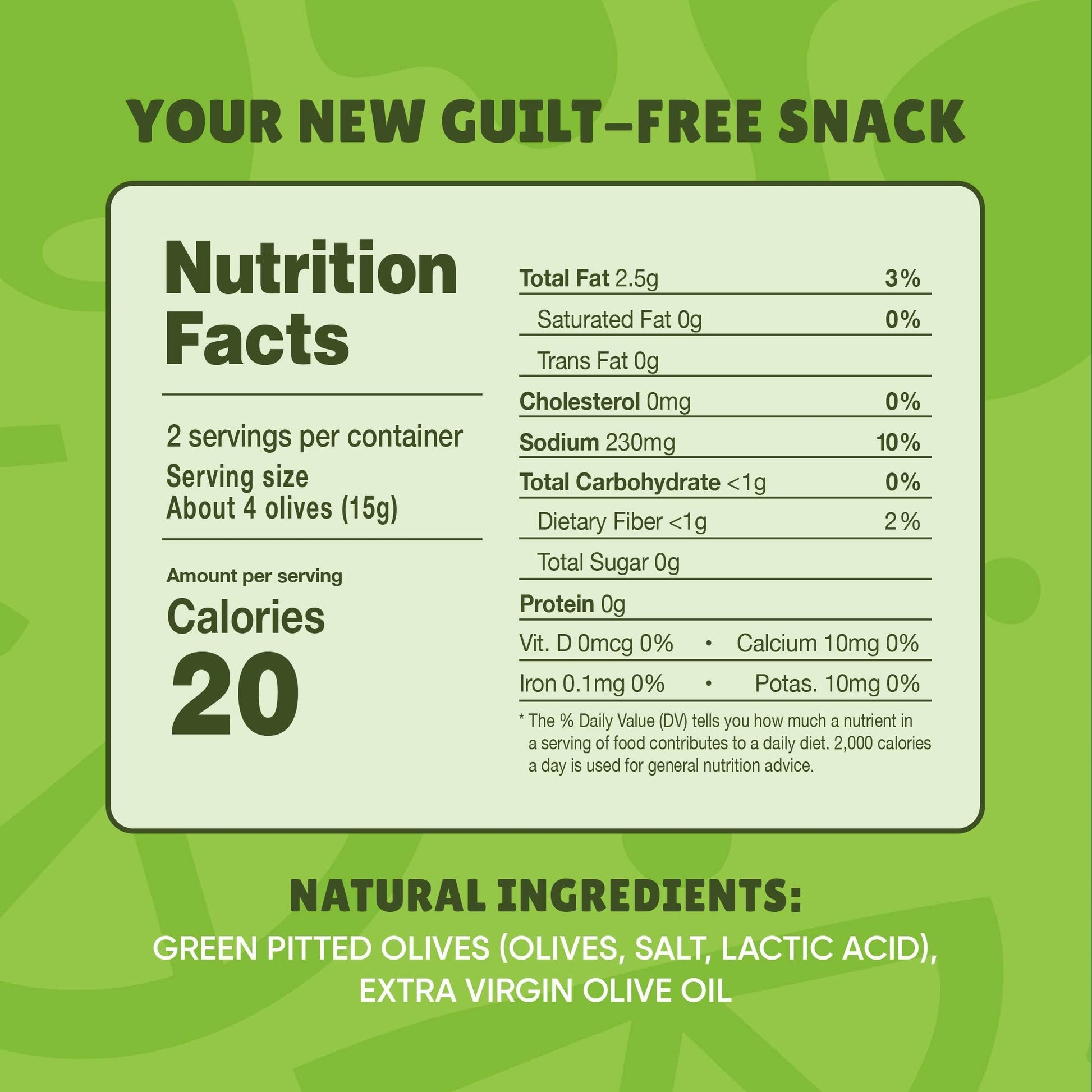 Q: What ingredients are used in Freestyle Snacks Olive Snack Packs?A: Freestyle Snacks Olive Snack Packs are made with high-quality marinated olives, extra virgin olive oil, and unique spices. All ingredients are 100% plant-based, all-natural, and free from additives.