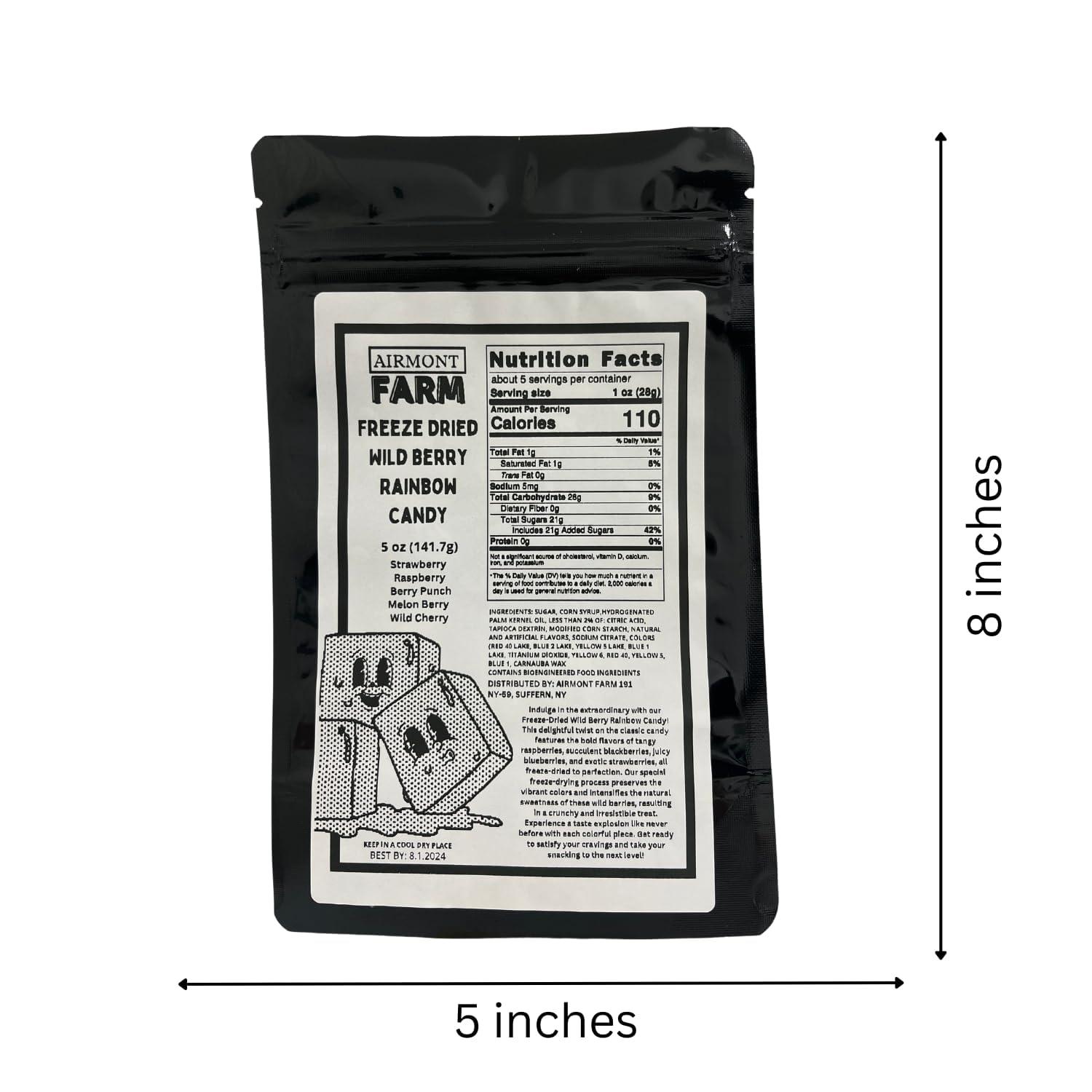- Q: How should I store the Freeze Dried Wild Berry Rainbow Candy? A: To maintain the freshness and quality of your Freeze Dried Wild Berry Rainbow Candy, store it in a cool, dry place. The candy comes in a resealable Mylar bag, which helps protect it from moisture and air after each use, ensuring you can enjoy it at your own pace.