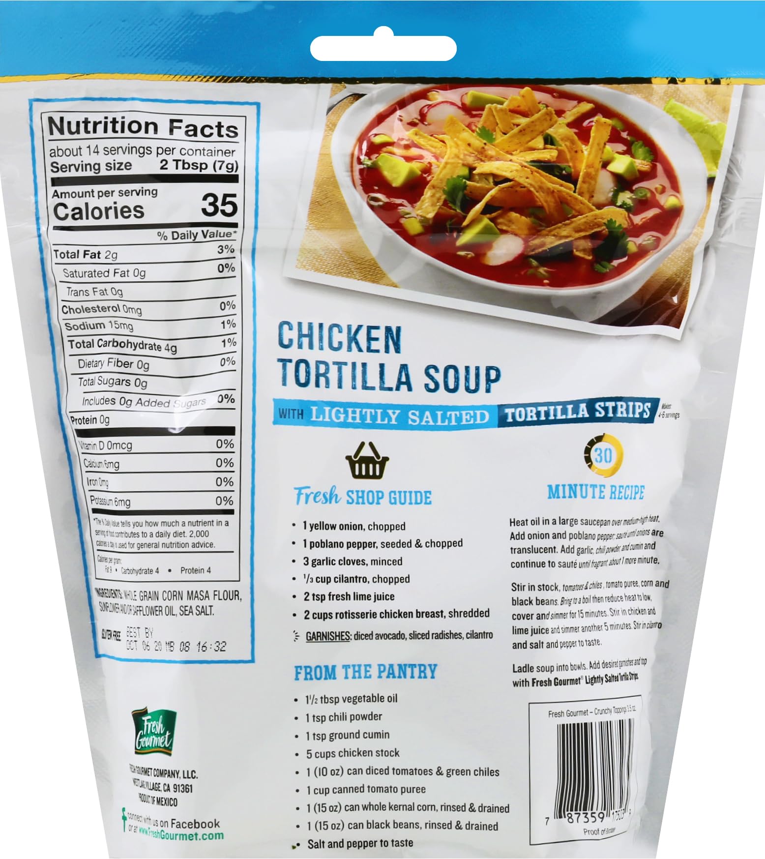 Lightly Salted Tortilla Strips Are The Perfect Complement To Your Favorite Soups And Salads. Our Lightly Salted Tortilla Strips Are The Perfect Complement To Your Favorite Salads Or Side Dishes. With Just Enough Crunch And Light Seasoning To Satisfy Your Snack Craving, And Just The Right Texture To Lend That Special Touch To Your Dish, Fresh Gourmet Lightly Salted Tortilla Strips Are The Perfect Addition To Your Meal. At Fresh Gourmet, We Bring Good Taste To Your Table - Every Day. Fresh Gourmet Is The Number One Brand Of Croutons And Salad Toppings Sold In The World. Long Known For The Innovative Approach That Inspired The Original Produce Crouton, The Fresh Gourmet Brand Offers The Largest Variety Of Salad Toppings Available On The Market Today. As Salad Toppings Experts, Fresh Gourmet Sets The Pace With Todays Trends, Offering Busy Cooks The Crunch, Flavor And Texture That Transform Everyday Dishes Into Memorable Meals In Minutes. For Nearly 30 Years, Fresh Gourmet Continues To Be The One Brand You Turn To For The Crunch You Crave!