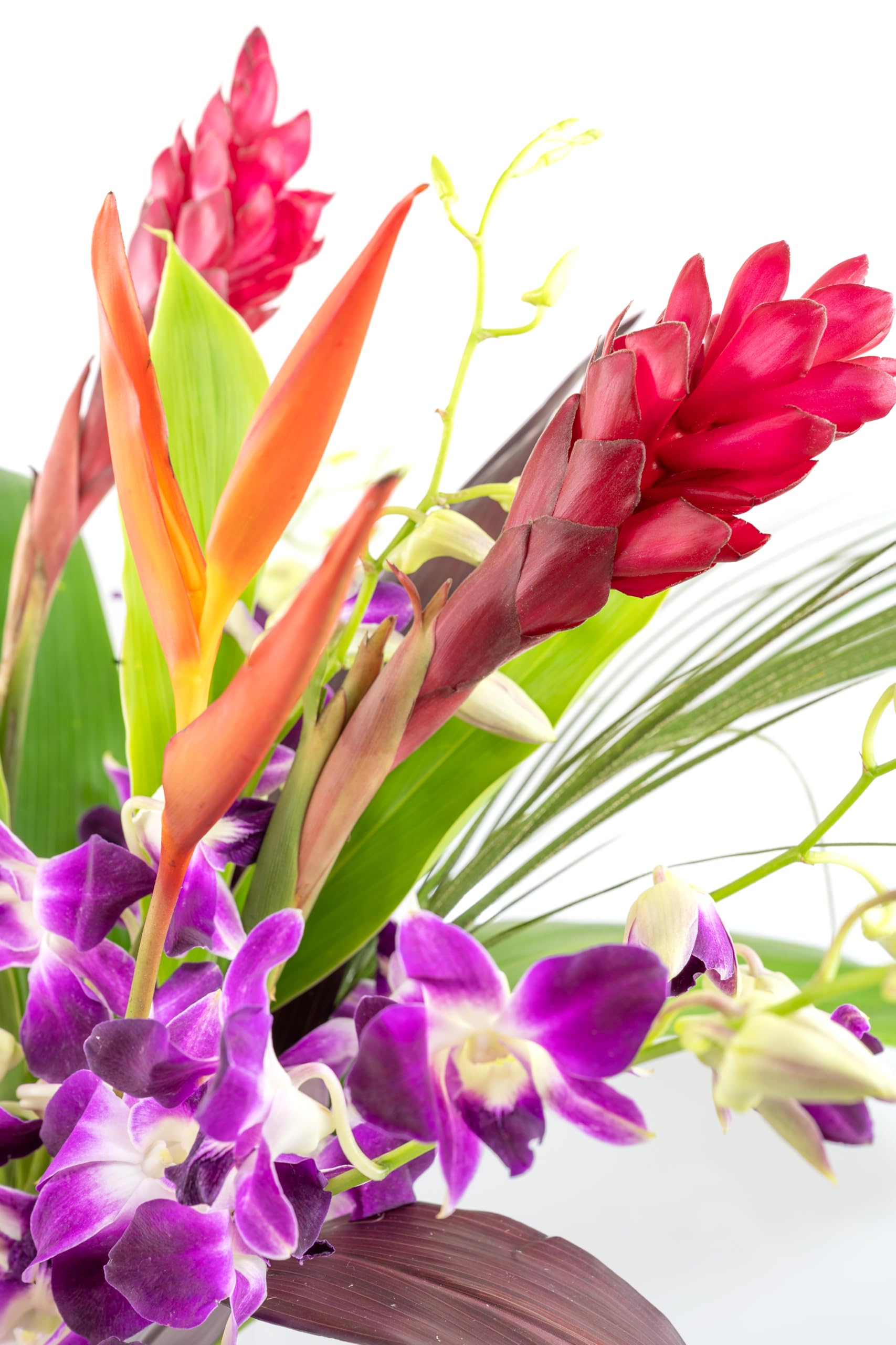 Transform Any Space Into A Tropical Paradise With This Stunning Hawaiian-Style Flower Arrangement. This Luxurious Bouquet Features Vibrant Purple Dendrobium Orchids, Striking Red Ginger Flowers, And Majestic Birds Of Paradise, All Perfectly Complemented By Lush Mixed Tropical Foliage. Professionally Arranged In A Classic Glass Vase, This Arrangement Makes A Bold Statement With Its Exotic Blooms And Dramatic Presentation. The Combination Of Deep Purples, Fiery Oranges, And Rich Reds Creates An Eye-Catching Display That'S Perfect For Special Occasions Like Birthdays, Anniversaries, Or Mother'S Day. Each Flower Is Carefully Selected And Arranged To Ensure Maximum Visual Impact And Longevity. The Substantial Size And Premium Quality Of This Arrangement Make It An Impressive Gift That'S Sure To Delight Any Recipient. This Beautiful Bouquet Brings The Warmth And Beauty Of Hawaii Right To Your Doorstep, Making It An Ideal Choice For Adding A Touch Of Tropical Elegance To Your Home Or Office.