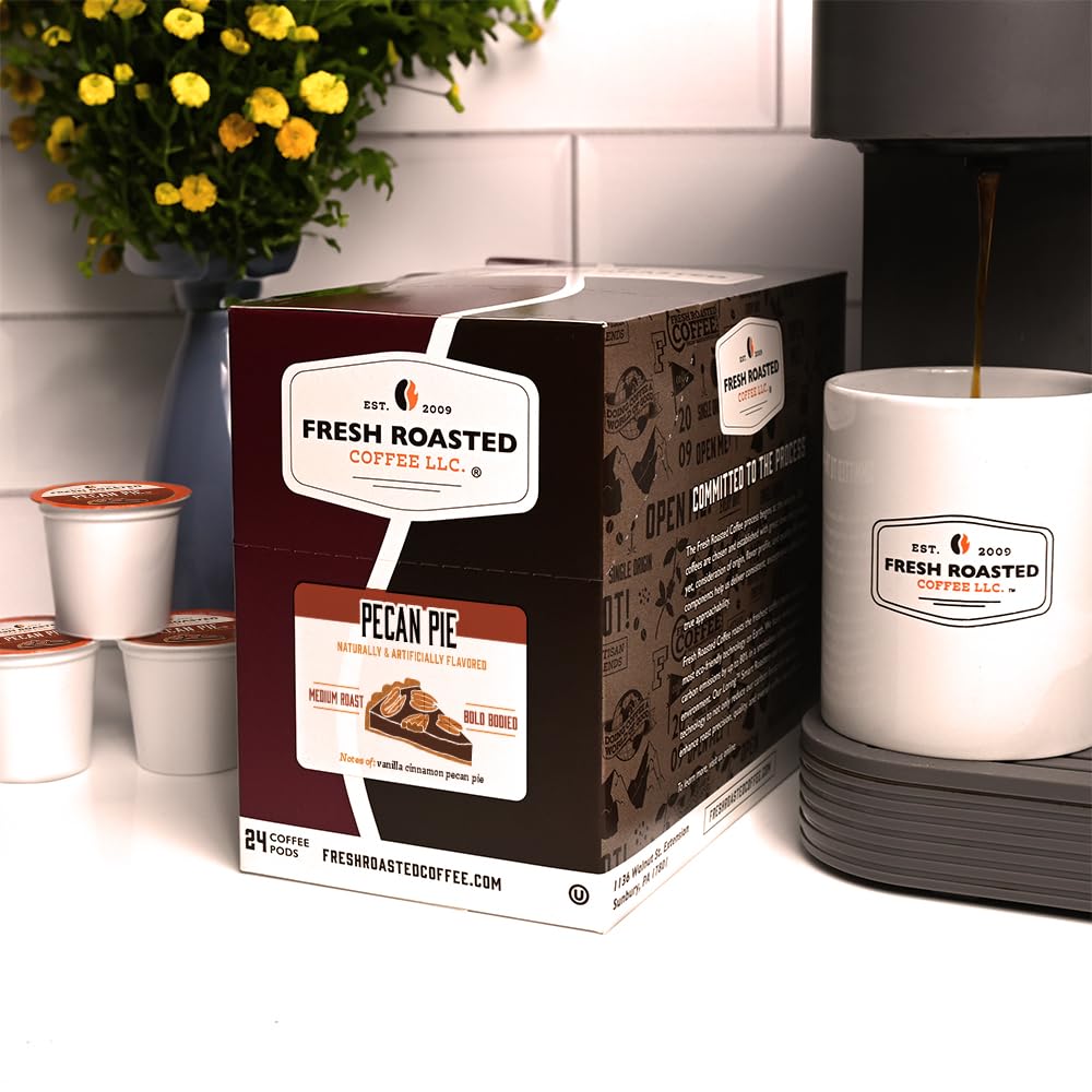 Q: What flavors are included in the Fresh Roasted Coffee Pecan Pie Pods?A: The Fresh Roasted Coffee Pecan Pie Pods feature a delightful blend of caramelly, buttery, and nutty flavors inspired by the classic pecan pie dessert, providing a guilt-free coffee experience.