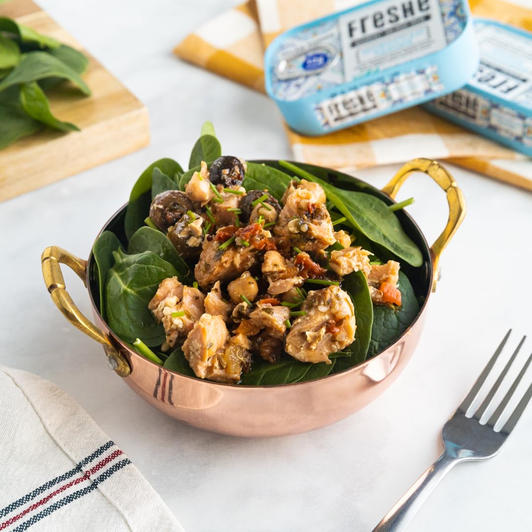 FRESHE'S NEW GOURMET SALMON IS HERE: A traditional North African slow simmered succulent stew. This protein packed, portable meal is full of flavor and healthy ingredients. Featuring ASC certified sustainable farmed salmon, our European-style tins combine nutrition and culture into one. Open up a fresh pack of salmon with chickpeas, onions, roasted zucchini, quinoa, olives, lemon, carrots and fennel for a wonderful snack or small meal. | ALL-NATURAL CERTIFIED SUSTAINABLE SALMON: Freshé premium canned salmon is made from ASC certified sustainable farmed salmon, then blended with our non-GMO ingredients that are packed into a pocket-sized BPA-free tin with fresh olive oil and hearty vegetables for the perfect Mediterranean inspired snack or meal. | HEALTHY ON-THE-GO SNACK: This high-protein salmon is gluten-free and is a great source of vitamins, minerals and omega-3s. As a non-sugary snack with simple ingredients, it is the perfect healthy snack for kids and adults alike, helping give you energy to power you through the day. | PERFECT FOR ANY OUTDOOR ADVENTURE: Freshé is the perfect portable on the go option for healthy, delicious eating wherever you are. Take this 4.25 Ounce BPA-Free Tin on the go with you so that you can have a healthy snack wherever; hiking, backpacking, camping, and more. | SMALL MEALS, BIG PROTEIN: From the vivid coastlines of Portugal and Spain, Freshé brings an old European tradition of artisanal tinned meals to the American shore. Ready-to-eat, globally inspired small meals with simple ingredients; vibrant superfoods and sustainably sourced protein, infused with savory herbs & spices. Crafted in time-honored style.