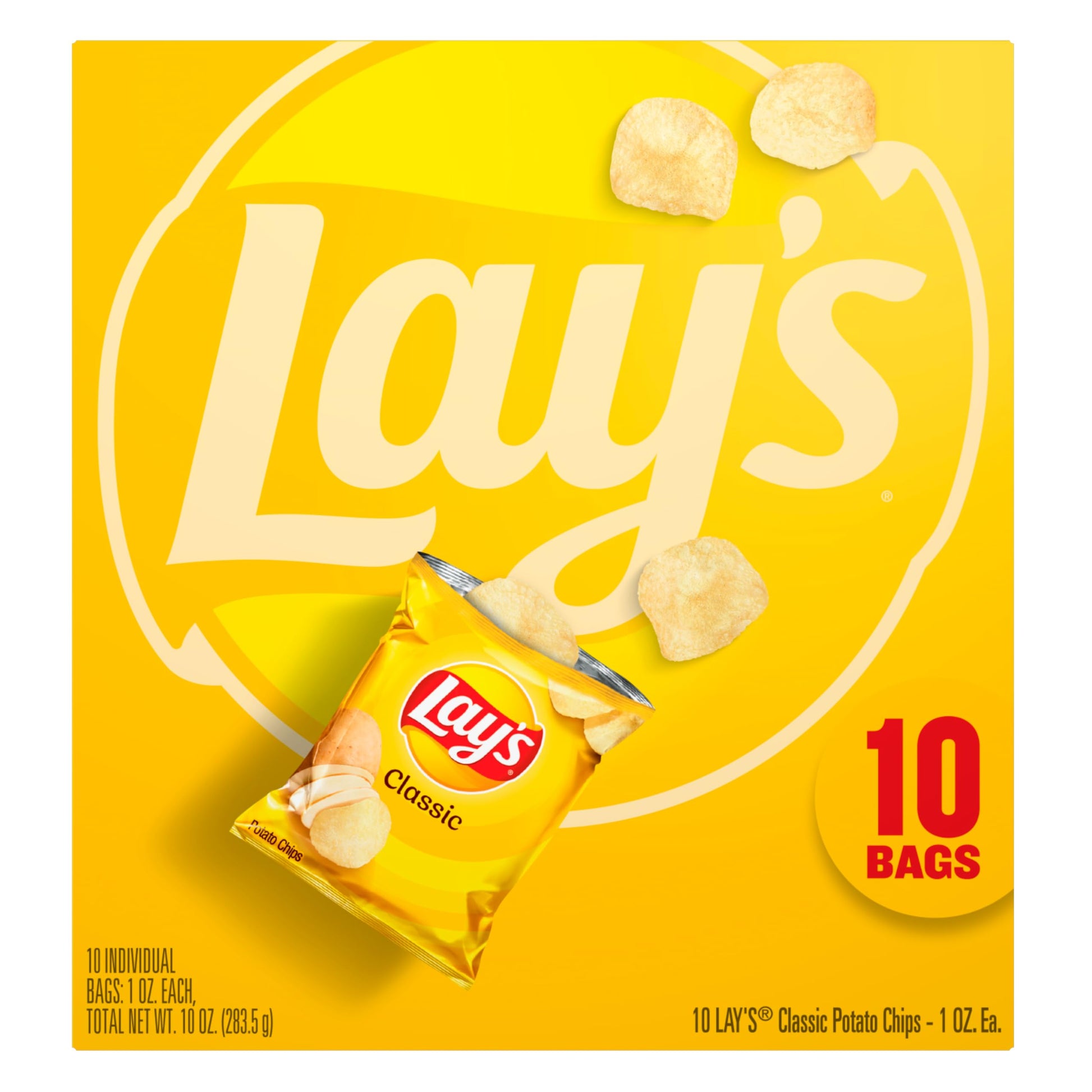 Q: How many bags are included in a pack of Lay's Classic Potato Chips?A: Each pack of Lay's Classic Potato Chips includes 10 individual bags, each containing 1 ounce of chips, making it easy to enjoy snacks on-the-go.