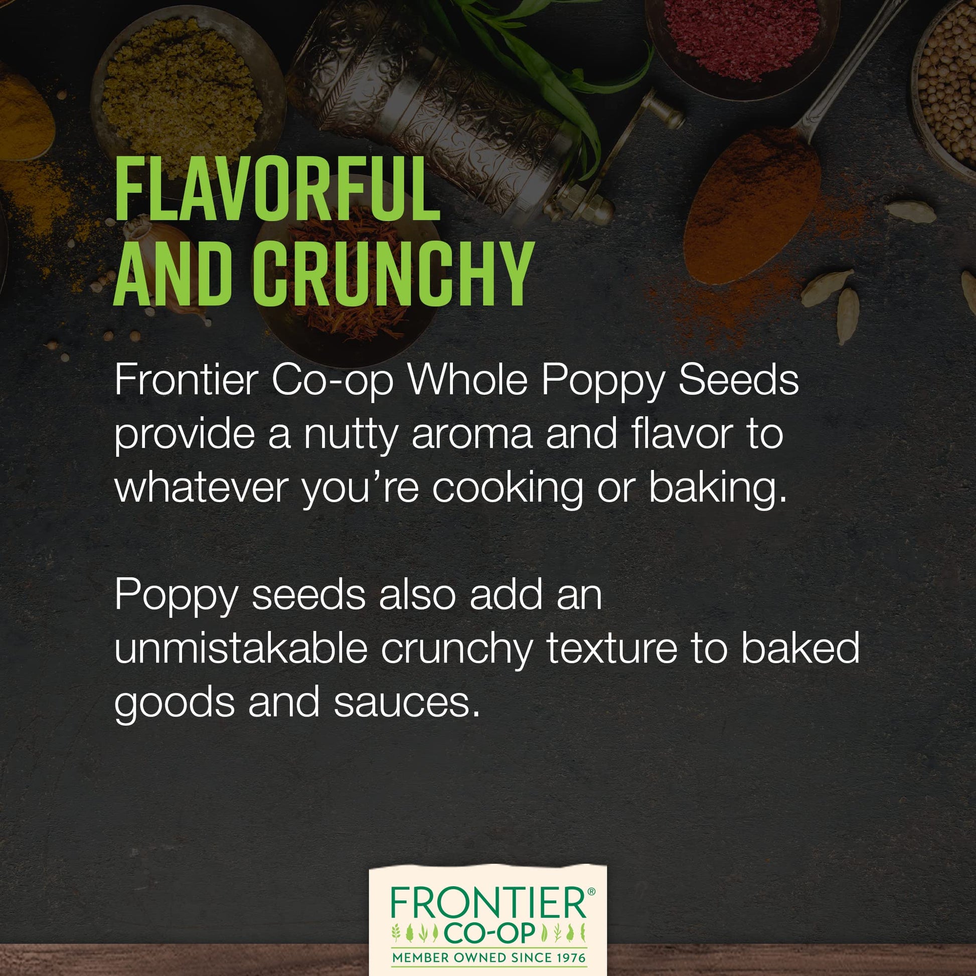 Indulge in the rich, nutty flavor of Frontier Co-ops Whole Poppy Seeds. Sourced from the finest crops, our poppy seeds are a treasure for your culinary creations. Whether youre a professional chef or a home cook, these seeds are perfect for adding a burst of flavor and texture.Perfect for Baking and Cooking: Our poppy seeds bulk pack is ideal for a variety of recipes. From traditional poppy seed dressing recipes to delicious baked goods like muffins and bread, these seeds are versatile. Use our bulk poppy seeds for baking to ensure you always have enough for your culinary experiments.Kosher and Nutritious: Embrace the goodness of Poppy Seeds, a natural and healthy addition to your diet. Packed with essential nutrients, they are perfect for those who value health without compromising on taste.DIY Ground Poppy Seeds: These whole blue poppy seeds grind smoothly, offering a fresh ingredient for your recipes.Ideal for Everyday Cooking: Not just for baking, our poppy seeds for cooking enhance salads, dressings, pastries and savory dishes. With poppy seeds for eating in every meal, enrich your diet with their unique taste and health benefits.Convenient 1lb Pack: Our poppy seeds for baking 1lb package ensures you have a steady supply for all your baking and cooking needs. The resealable bag keeps the seeds fresh and ready for use.Frontier Co-ops commitment to quality is evident in every bag of our Poppy Seeds. We bring you only the best, so you can enjoy the delightful taste and health benefits in every bite.