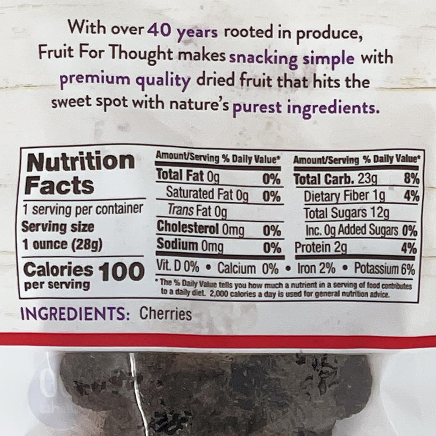 - Q: What makes Fruit for Thought Dried Cherries a healthy snack option? A: Fruit for Thought Dried Cherries are a healthy snack choice because they contain no added sugars or artificial ingredients, are made from real fruit, and provide essential nutrients while being low in calories.
