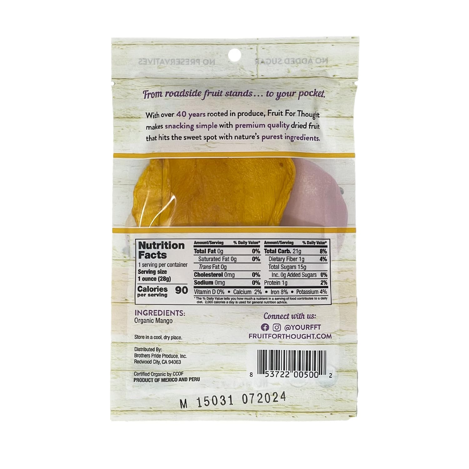 - Q: How many bags are included in a pack of Fruit for Thought Organic Dried Mango? A: Each pack of Fruit for Thought Organic Dried Mango includes twelve individual bags, with each bag containing one ounce of dried mango.