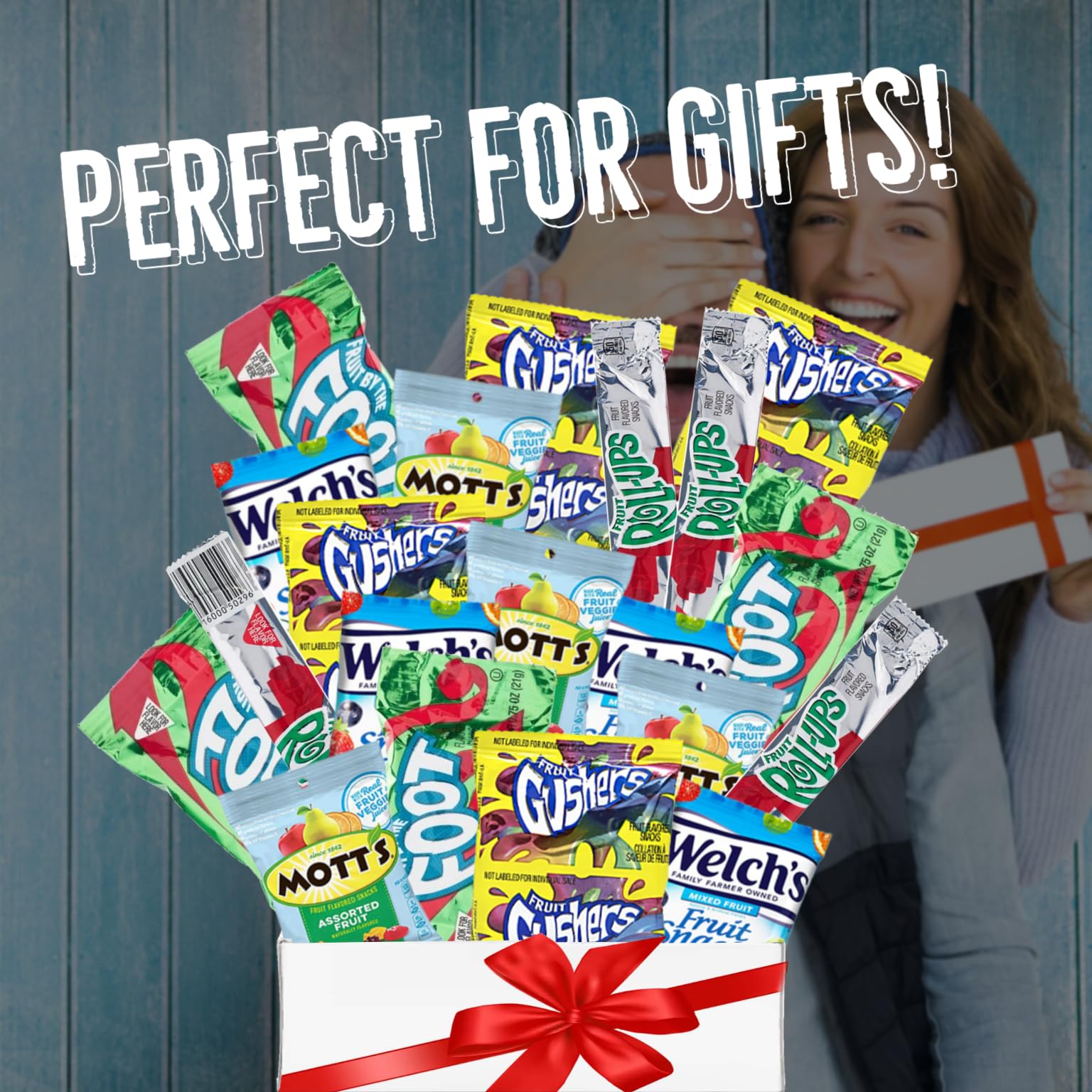 This delicious assortment of fruit snacks, fruit roll-ups, gummies, and fruit gushers includes 100 of your favorite snacks for adults and kids including (24) Mott's Medleys Assorted Fruit Snacks, (24) Welches Mixed Fruit Snacks, (14) Gushers Strawberry Splash and Tropical Flavors, (14) Fruit by the Foot Snacks Berry Tie-Dye and Strawberry, and (24) Fruit Roll-Ups Why choose us? BUSSIN BOXES isn't your ordinary gift box company. All of our items are packaged professionally in the USA and we view every order as an opportunity to exceed our customers expectations. Every product we sell are perfect as care packages or gifts! Although our customer's purchase most often for themselves; we know they also love to gift them for holidays and special events including College Final Exams, Birthday's, Thanksgiving, Halloween, Christmas, Valentine's Day, Easter and more! Do yourself a favor and order one today!