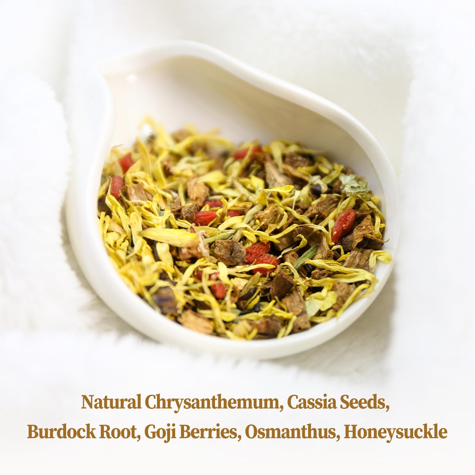 - Q: What are the key ingredients in FullChea Chrysanthemum Cassia Seed Tea? A: FullChea Chrysanthemum Cassia Seed Tea contains premium ingredients including cassia seeds, burdock root, goji berries, chrysanthemum flowers, sweet-scented osmanthus, and honeysuckle. These ingredients are carefully selected and scientifically proportioned for optimal flavor and health benefits.