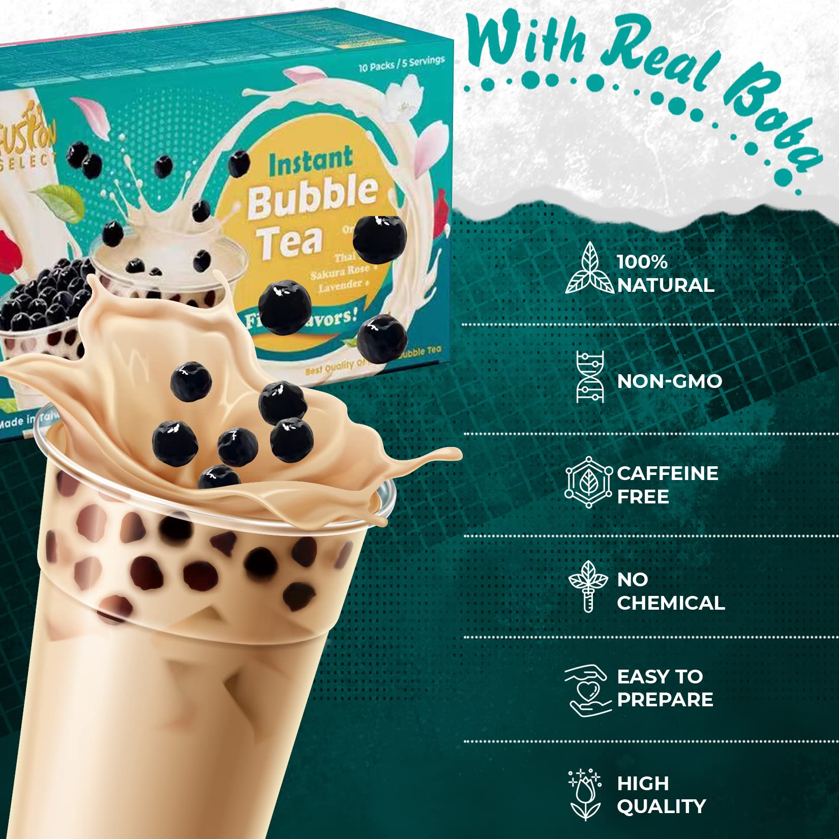 Q: What flavors are included in the Fusion Select Bubble Tea Kit?A: The Fusion Select Bubble Tea Kit includes popular flavors such as Sakura, Lavender, Rose, Thai Tea, and Original Milk Tea, allowing you to enjoy a variety of bubble tea experiences.