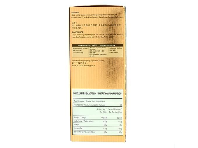 Q: How many servings are in each box of Ganocafe coffee?A: Each box of Ganocafe 3in1 dark roast Whole Bean Coffee contains 60 individual servings, making it a great choice for regular coffee drinkers.