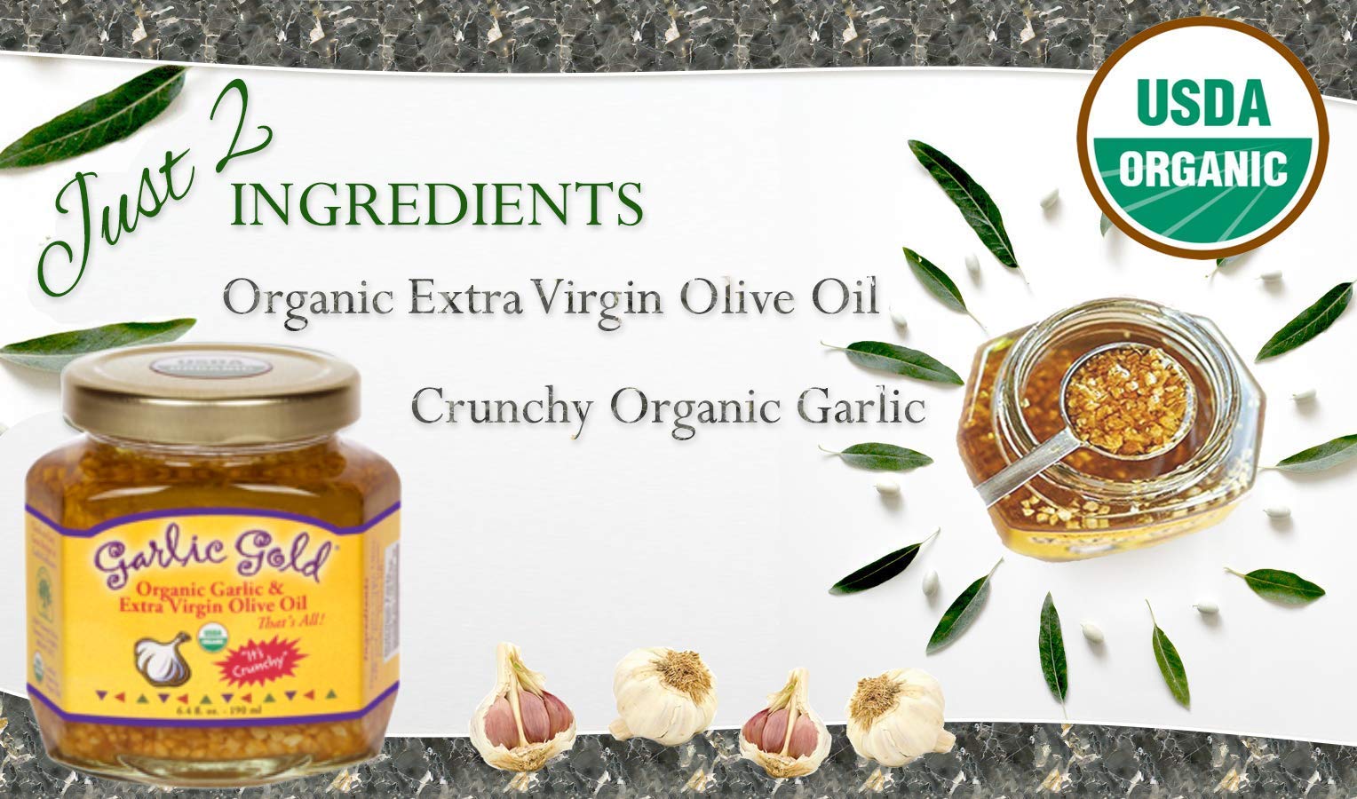Just 2 Tasty Ingredients! Organic Extra Virgin Olive Oil & Toasted Organic Garlic | Toasted, crunchy, organic garlic mixed with organic extra-virgin olive oil | A premium topping on anything, including salads, vegetables, pizza, sushi, baked & mashed potatoes, popcorn, pasta and more! | Perfect for the dinner table to enjoy the fresh taste of garlic | Butter's more sophisticated cousin & a must have organic condiment