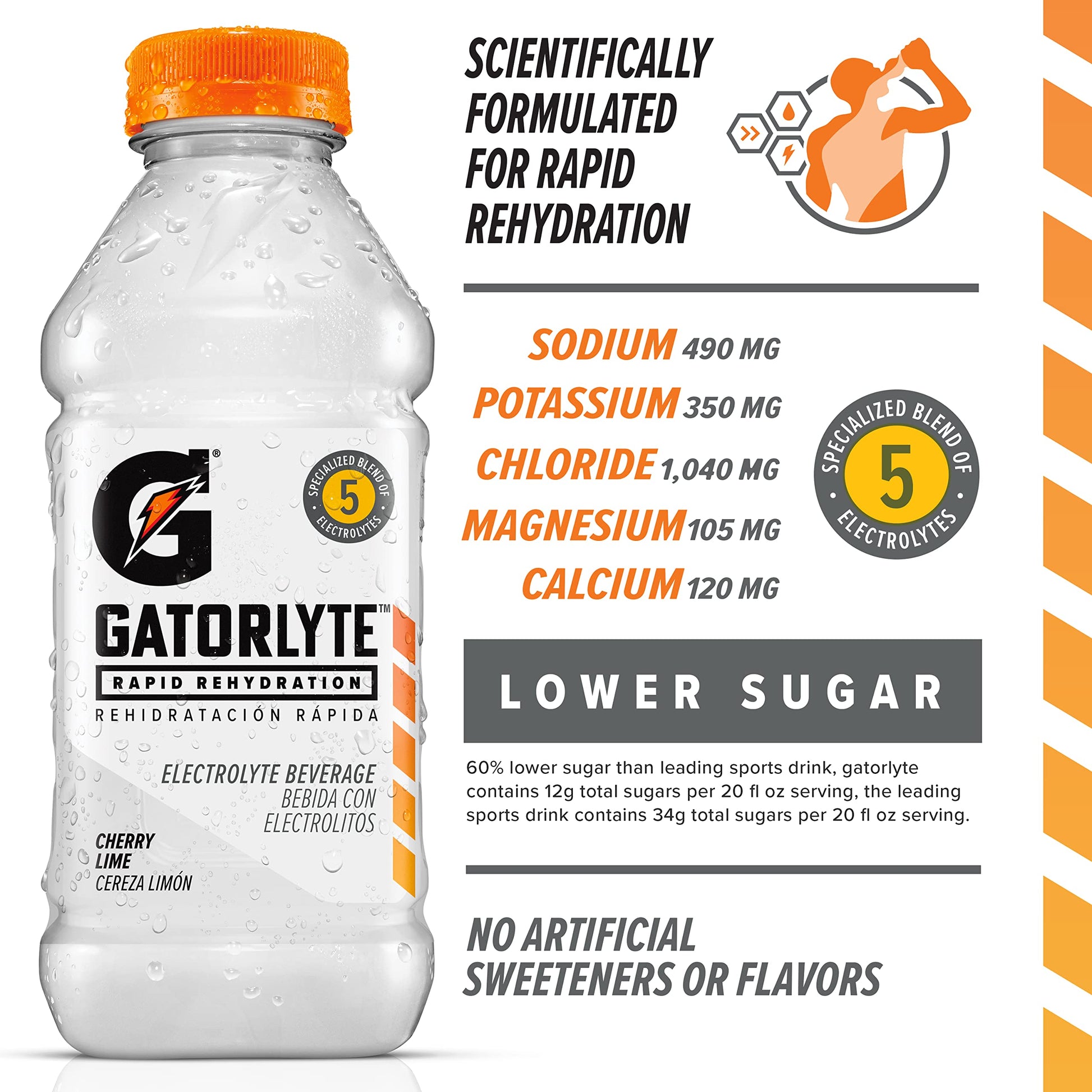 Gatolyte Rapid Rehydration Electrolyte Beverage is scientifically formulated for rapid hydration. Made with a specialized blend of 5 electrolytes and no artificial sweeteners or flavors. Made with 60% lower sugar than leading sports drink, Gatorlyte contains 12g total sugars per 20 fl oz serving, the leading sports drink contains 34g total sugars per 20 fl oz serving.