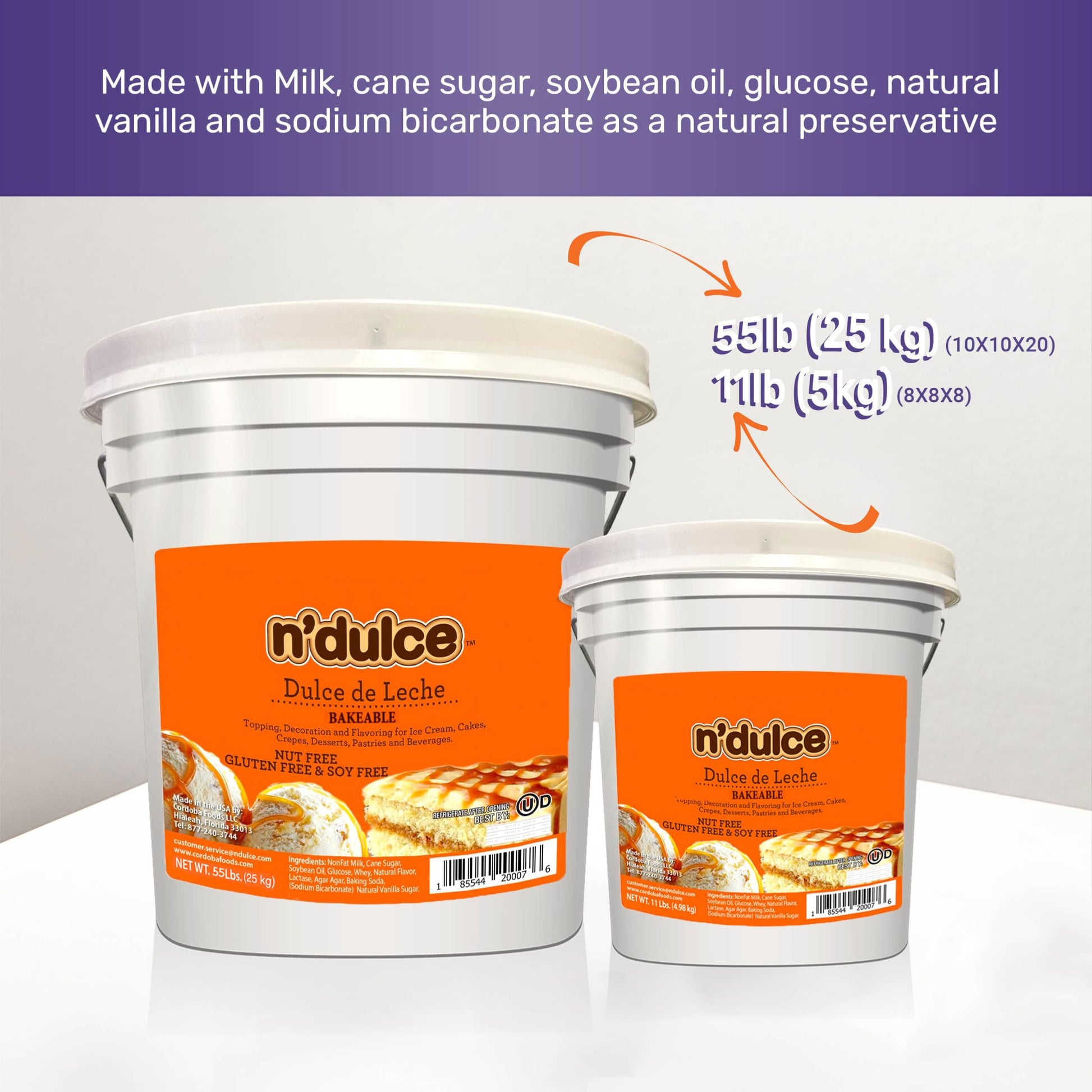 - Q: Is there a difference in flavor between the two available sizes of N'Dulce Dulce de Leche? A: No, both the eleven-pound and fifty-five-pound sizes of N'Dulce Dulce de Leche offer the same delicious flavor and quality; the difference lies only in the quantity.