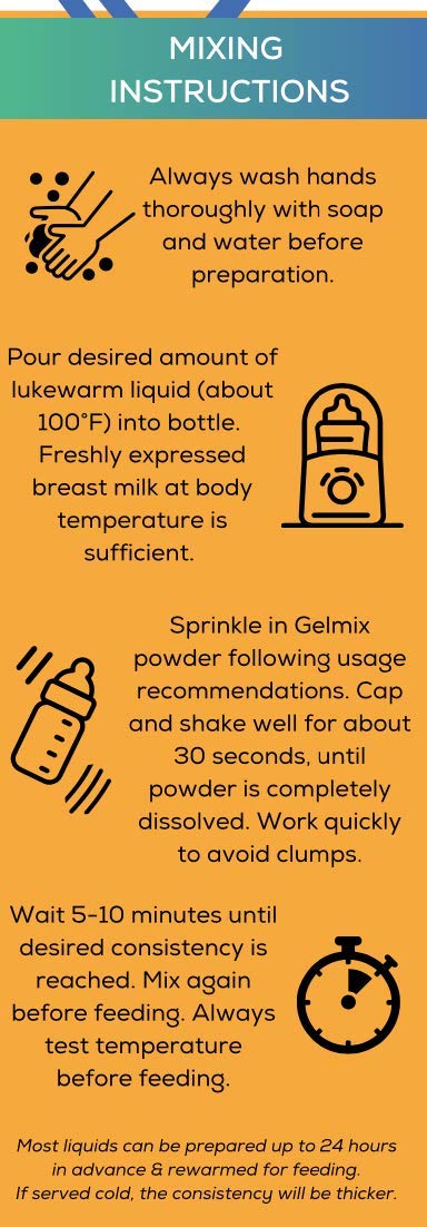 USDA Organic Thickener for Breast Milk & Formula. Each Box includes 30 individual serving 2.4g sticks. Each stick (2.4g) thickens 5-6 fl oz to slightly thick (thin nectar) or 3-4 fl oz to mildly thick (nectar). Gelmix is the first USDA organic thickener specifically formulated for pediatric use in America. Gelmix thickens breast milk and infant formula. Thickening liquids is often recommended for the management of conditions present with gastroesophageal reflux (GER) and dysphagia. Always consult a medical professional before thickening liquids to ensure it is appropriate for your infants individual needs. Gelmix is not for use with infants under 6 pounds and/or born preterm currently under a corrected age of 2 weeks. Do not use if galactosemia or allergy to galactomannans is suspected. Stop using if rash or other allergic reaction develops, and consult a physician immediately. There are very few cases of allergies to galactomannans in academic literature.