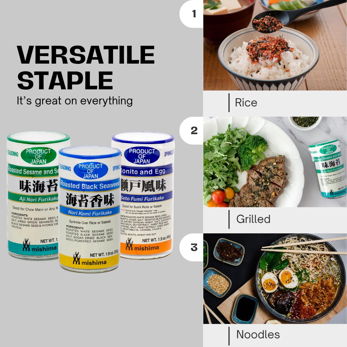 - Q: What are the different flavors included in the 3-Pack of Japanese Furikake Seasoning? A: The 3-Pack includes three flavors: Nori Komi (seaweed and sesame), Seto Fumi (with bonito and egg flakes), and Ajinori (seaweed-rich).