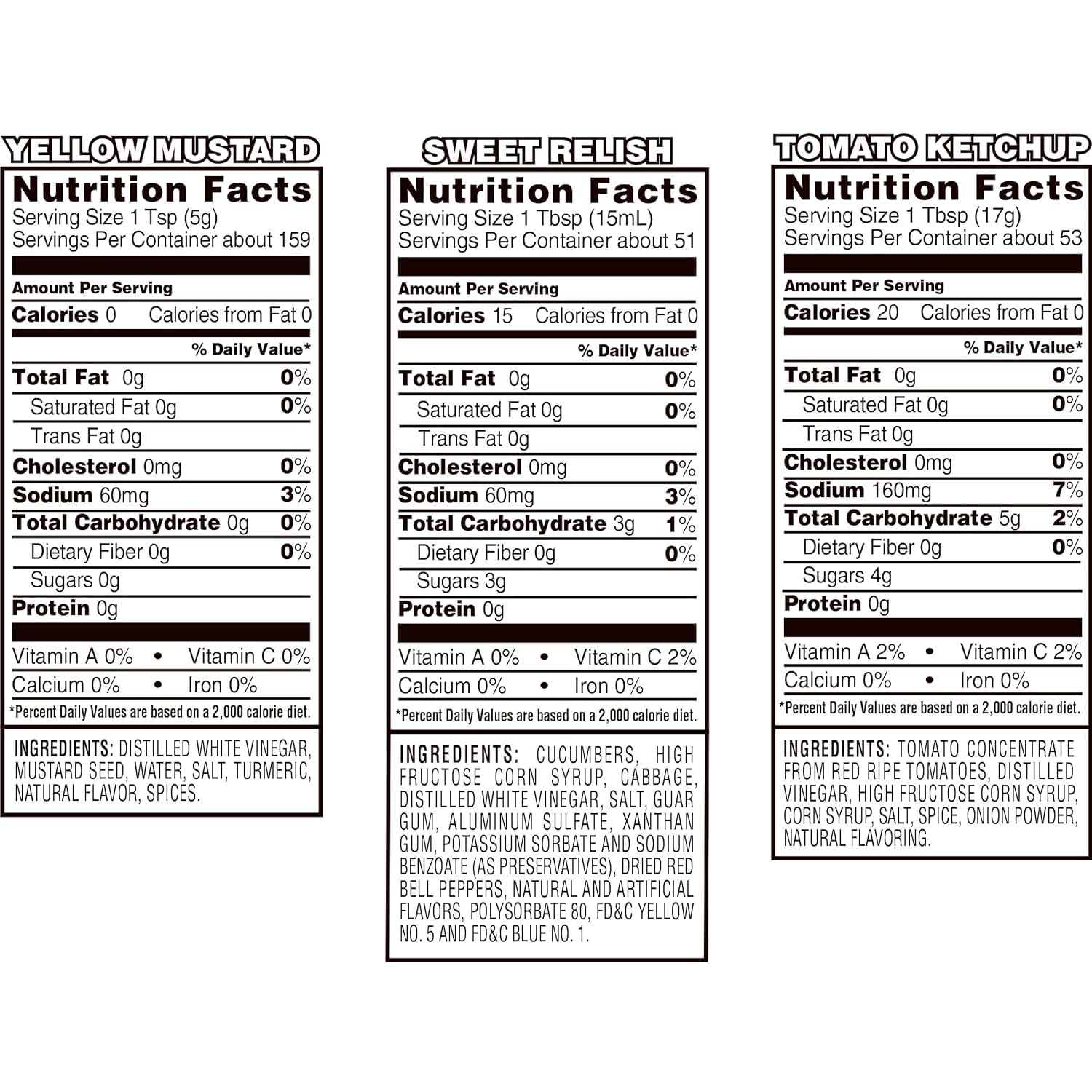 Q: What items are included in the Generic Ketchup, Mustard, and Sweet Relish Picnic Pack?A: The Picnic Pack includes two 32oz bottles of Tomato Ketchup, one 26oz bottle of Sweet Relish, and one 28oz squeeze bottle of Yellow Mustard.