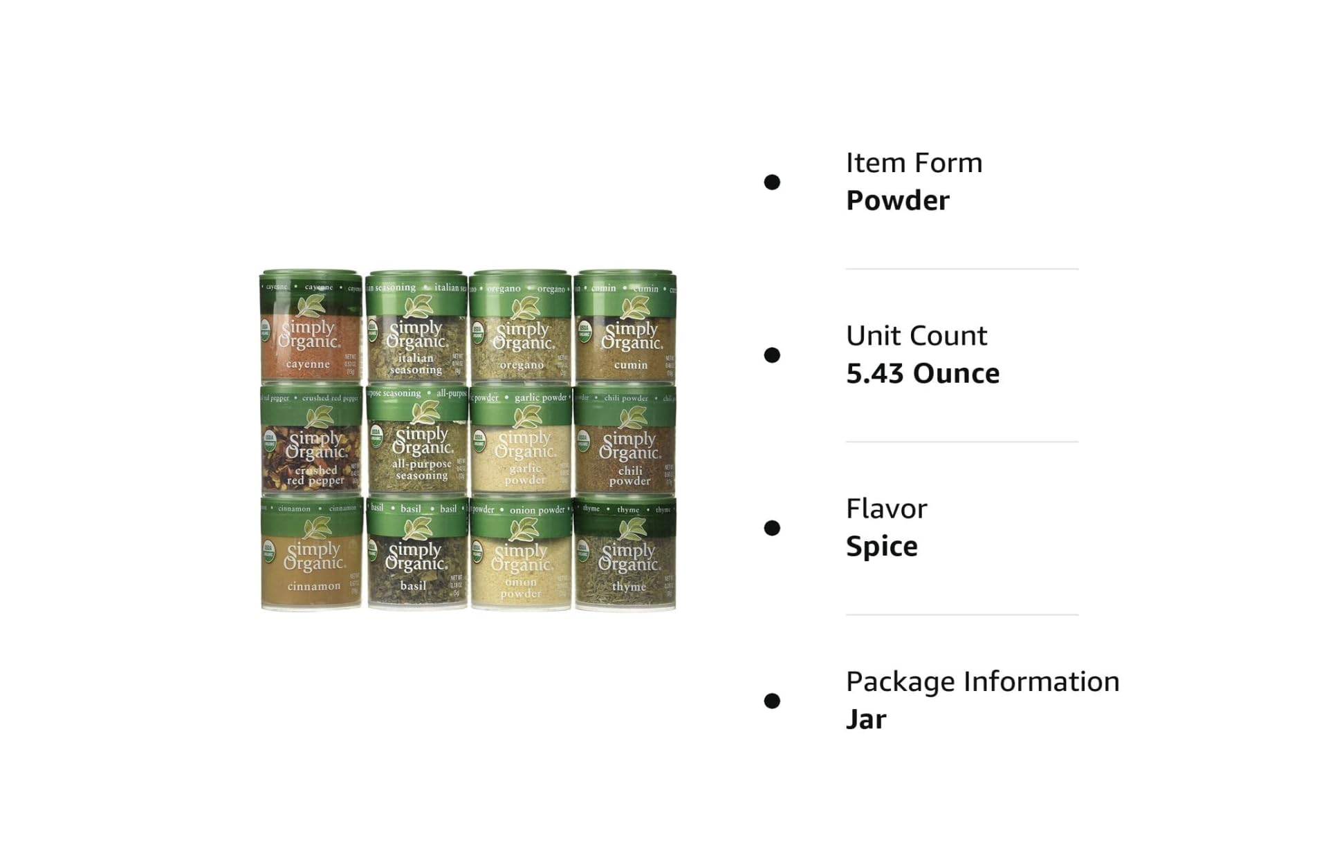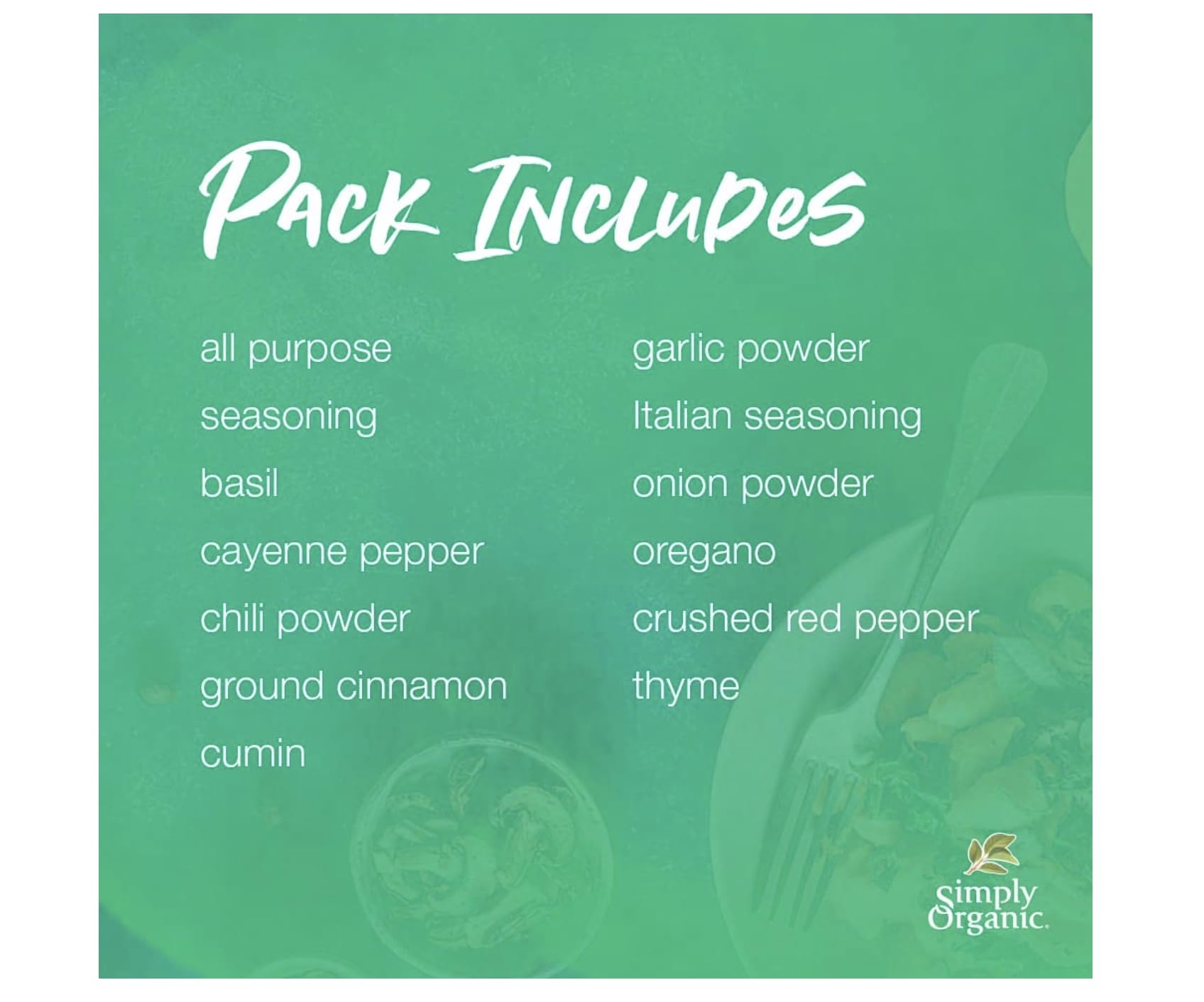 Starter Spice Gift Set - Whats Life Without A Little Spice Whether You Are A Newlywed, A New Homeowner, Or An Aspiring Home Cook Looking To Get Your Spice Assortment Started, Simply Organic Spice Gift Set Is A Great Gift To You Or Someone Equally As Special. Filled With Fresh, Flavorful Organic Spices Our Spice Set Transforms Empty Spice Drawers Into The Ultimate Spice Rack Or Spice Cabinet. Essential Organic Spices - Our Ultimate Organic Starter Spice Gift Set Includes 12 Of Our Most Popular, Pure And Potent Culinary Spices. From Our Awarded Best Ground Cumin By Cooks Illustrated To Our Warm, Vibrant Cinnamon Youll Be Ready To Go Way Beyond The Basics And Put Almost Any Recipe Within Reach. Convenient Mini Spices - Great For If Youre Tight On Storage Space Or Needing Just A Bit Of Any Particular Spice. Made From Plastic With A Tight-Fitting Versatile Sifter And Pour Spout Cap. Convenient Small Size For Easy Storage To Include In Any Spice Rack Or Spice Cabinet. Each Bottle Is Clearly And Beautifully Labeled To Keep Your Spice Cabinet Organized. Pure And Potent Flavor - Simply Organic Believes In Pure And Potent Flavor Grown At The Source. Our Rigorous Standards Mean That We Know Precisely What Youre Getting, And From Where. All The Spices In Our Gift Set Are Certified Organic By Qai (Quality Assurance International) And Certified Kosher By Ksa (Kosher Supervision Of America). Simply Organic Products Are Always Grown And Processed Without The Use Of Toxic Pesticides, Irradiation, Or Gmos. About Us - Simply Organic Is A 100% Certified Organic Line Of Spices, Seasoning Mixes, And Baking Flavors. Our Pure, Potent Spices, Seasonings And Extracts Bring Real Bite To Everything You Make, Eat And Share. Our Goal, Through Our Simply Organic Giving Fund, Is To Help The Millions Of Food Insecure By Not Only Providing Funds And Support To Make Organic Food More Accessible, But Also In Developing The Next Generation Of Leaders In Sustainable And Socially Just Organic Agriculture.