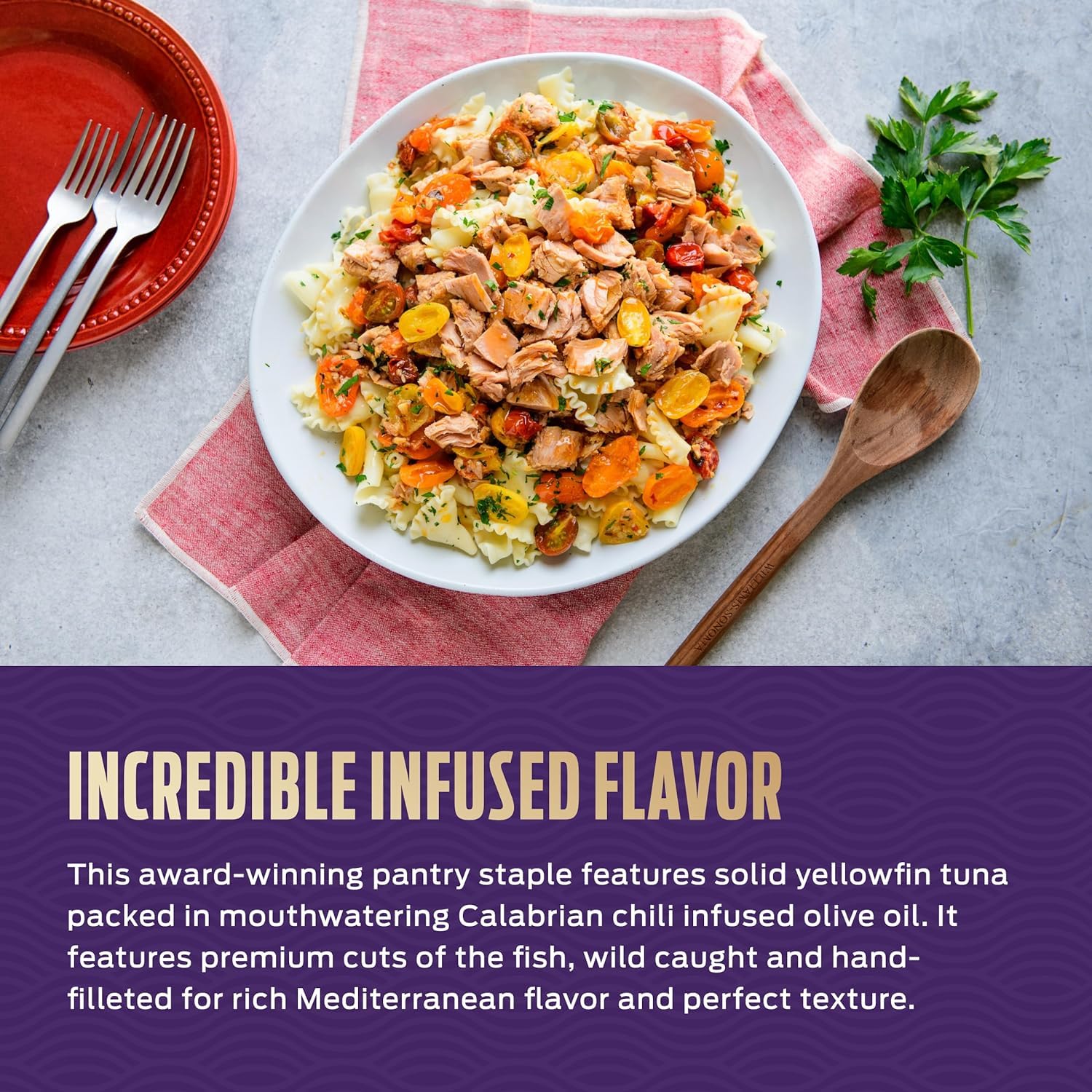 - Q: What makes Genova Premium Yellowfin Tuna different from other canned tunas? A: Genova Premium Yellowfin Tuna stands out due to its incredible flavor, which comes from being packed in Calabrian Chili-infused olive oil. This method not only enhances the taste but also uses the finest cuts of wild caught tuna, ensuring a high-quality product that is both delicious and nutritious.