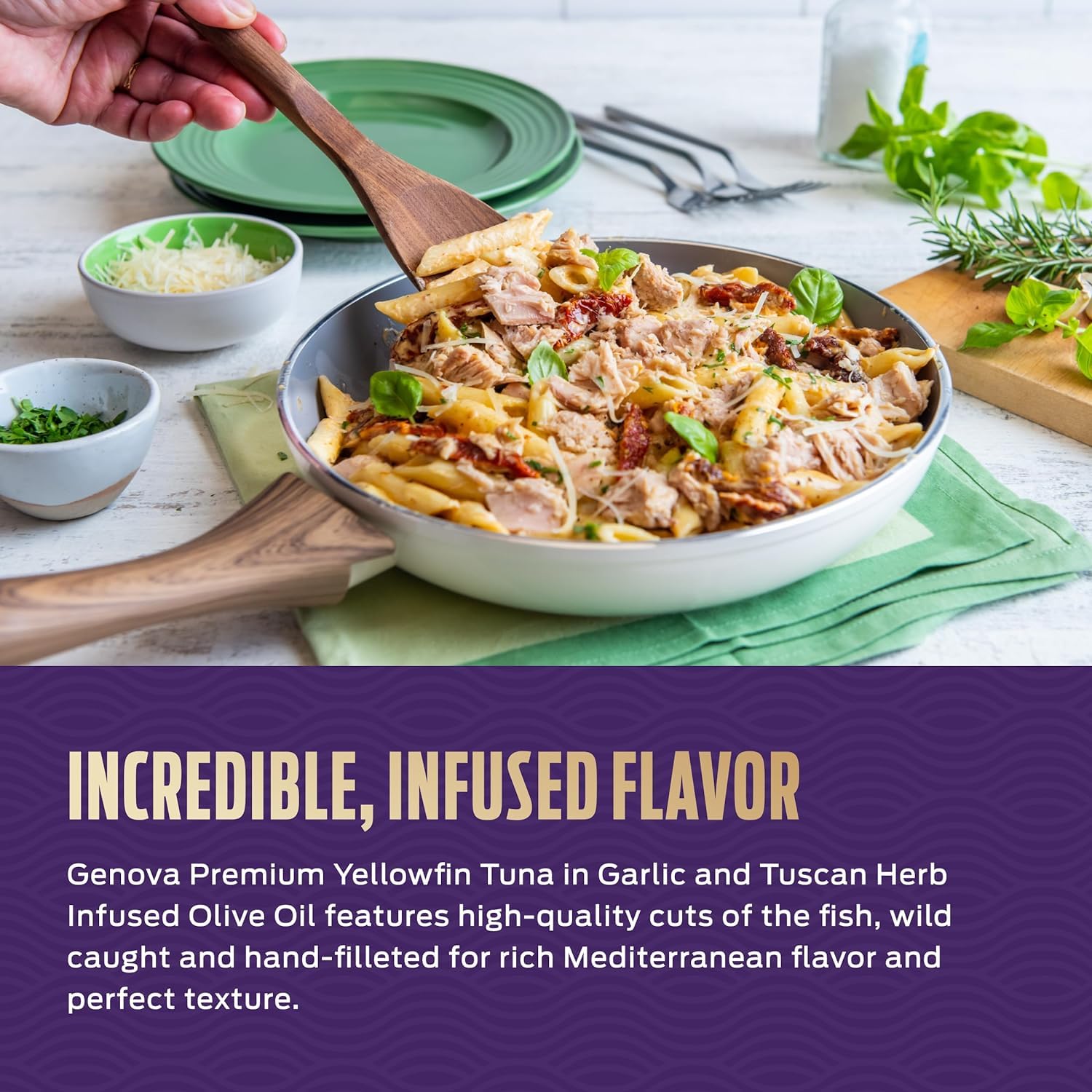 - Q: What makes Genova Premium Yellowfin Tuna unique compared to other canned tunas? A: Genova Premium Yellowfin Tuna stands out due to its rich flavor, as it is wild caught and hand-filleted, then packed in Garlic and Tuscan Herb Infused Olive Oil. This unique preparation enhances its taste, making it a versatile ingredient for various dishes.